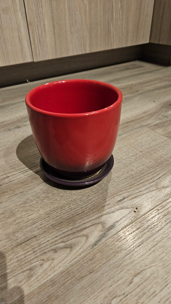 1000+Small red ceramic planter. Includes matching purple saucer. Drainage hole at the bottom. Perfect for small plants or succulents.
