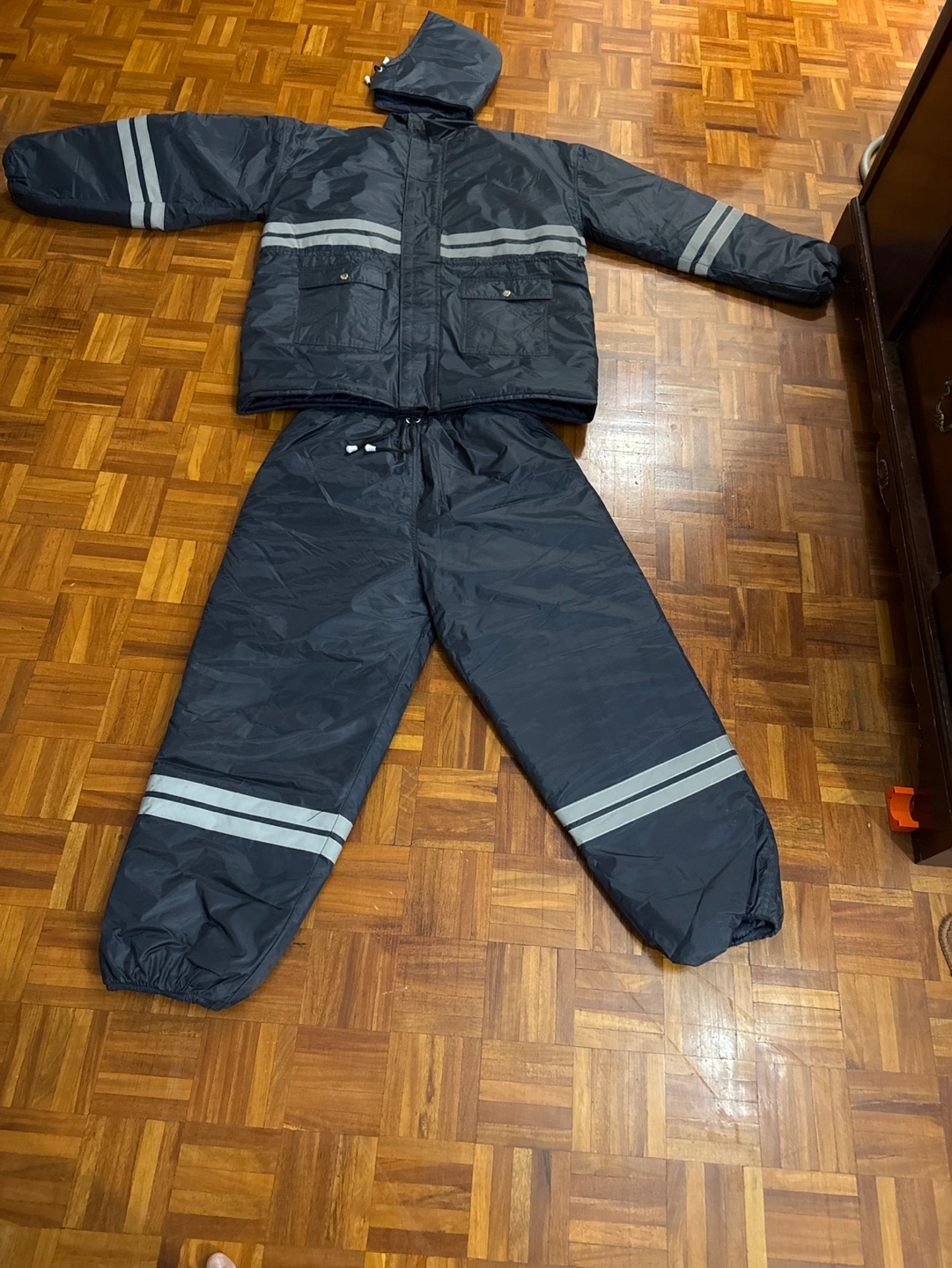 Two-piece winter suit. Jacket and pants. Features reflective strips. Drawstring waist. Attached hood.