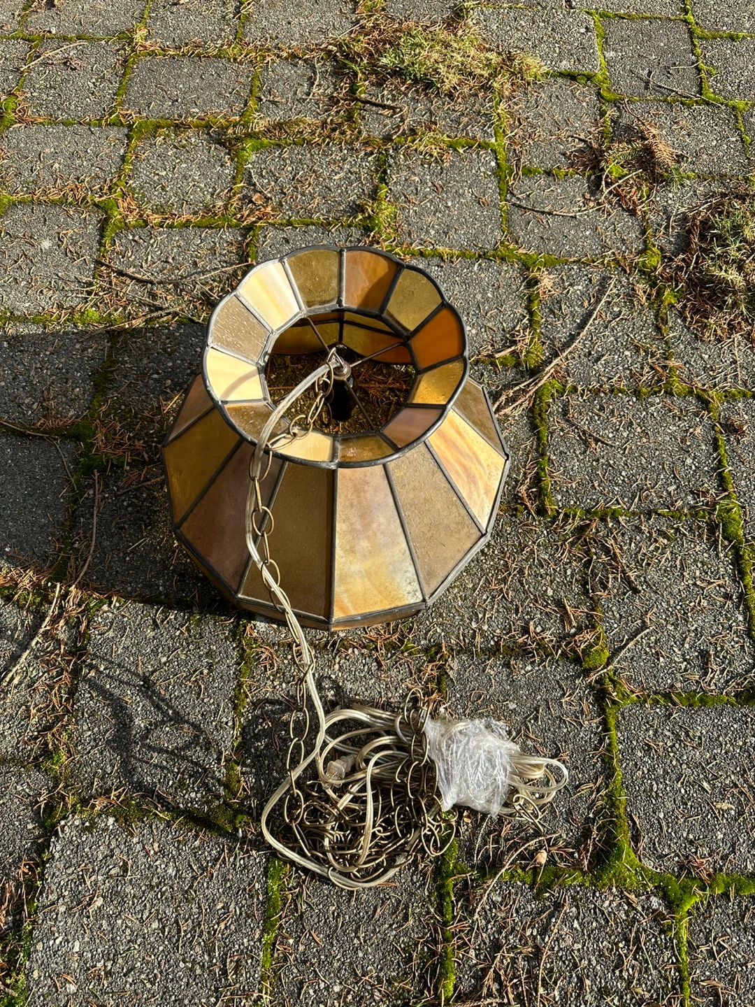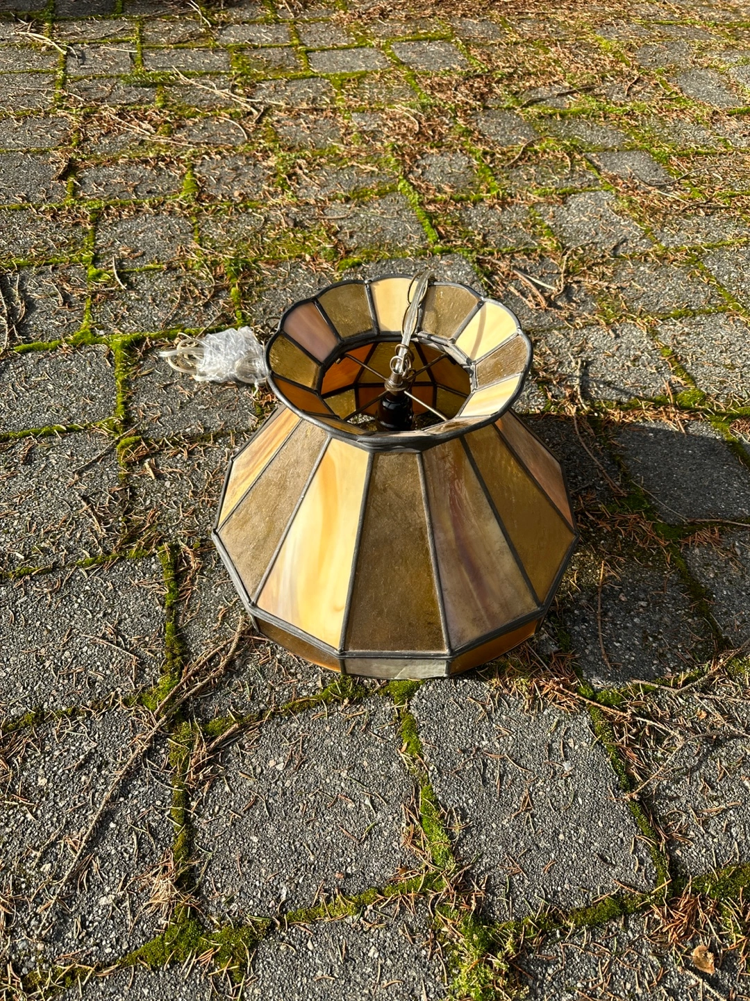 Beautiful vintage hanging lamp. Stained glass shade, amber and brown tones. Metal frame. Chain included. Shows some wear and tear, minor damage to bottom. Sold as is.