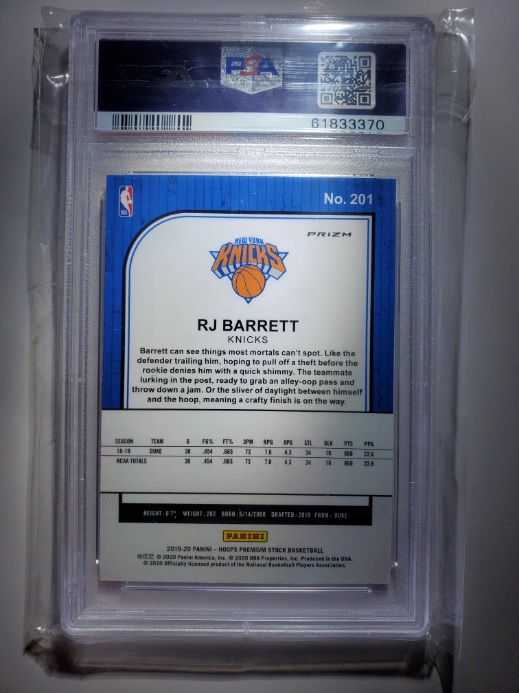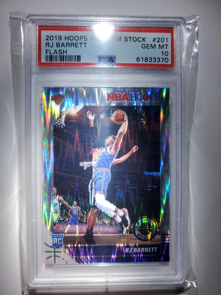 1342019 Torontos Raptors Star Canadian player RJ Barrett Rookie Card graded 10. top grade for PSA.