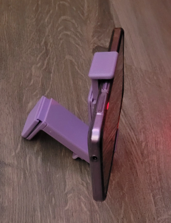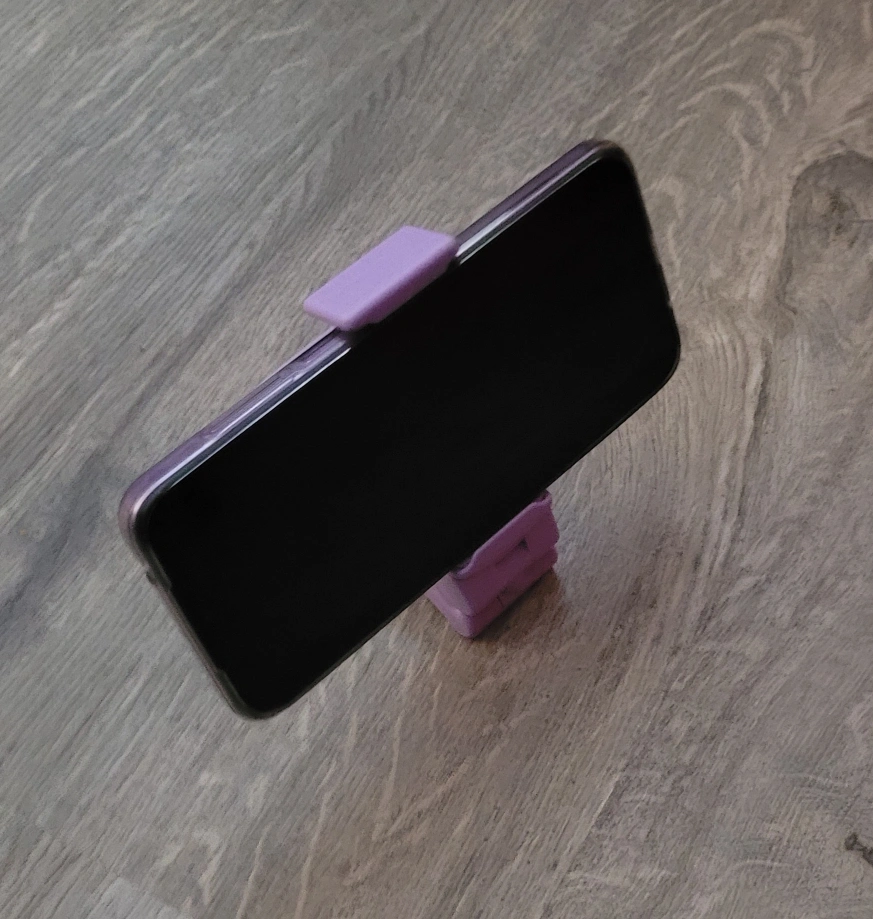 Adjustable phone stand. Clips onto various surfaces. 360-degree rotation. One-handed operation. Compact and portable. Great for watching videos or video calls.