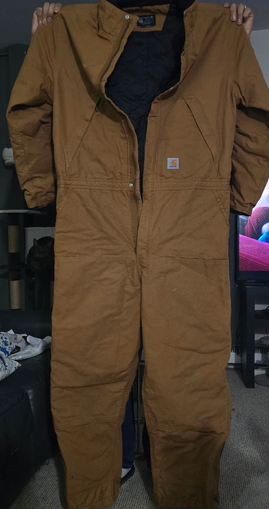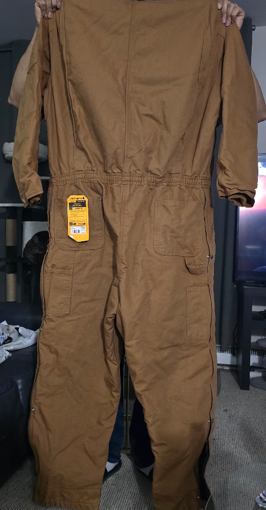 Men's Carhartt Washed Duck Insulated Coverall. Size Extra Large, Loose Fit. Brown colour. Cordura reinforced pockets, cuffs and kick panels. Insulation for extra warmth. Comfort flex waistband. Knee pad compatible. Ankle-to-waist leg zippers with storm flaps.