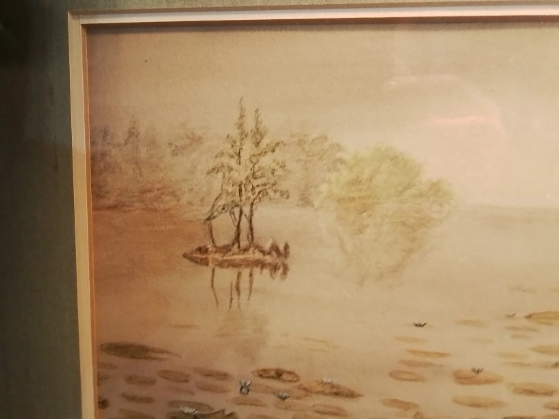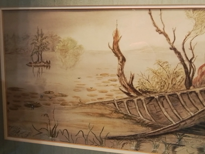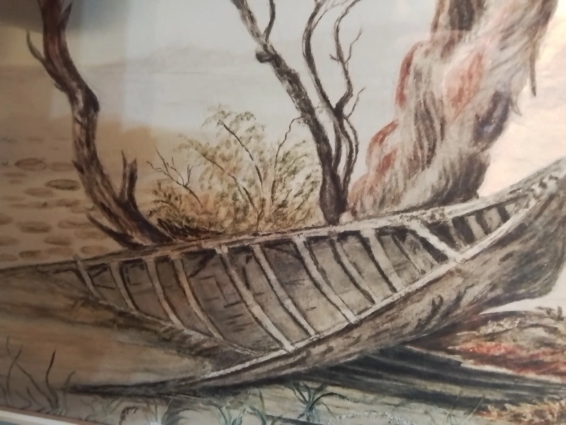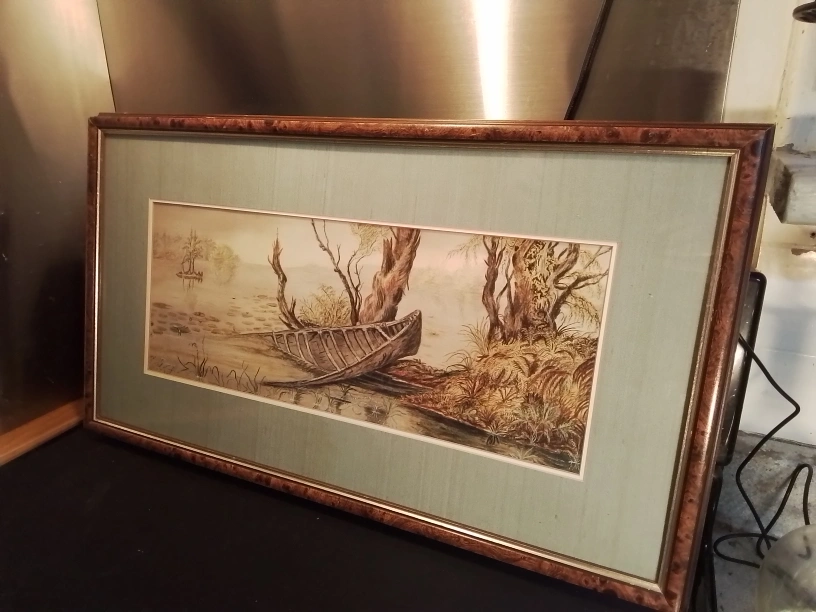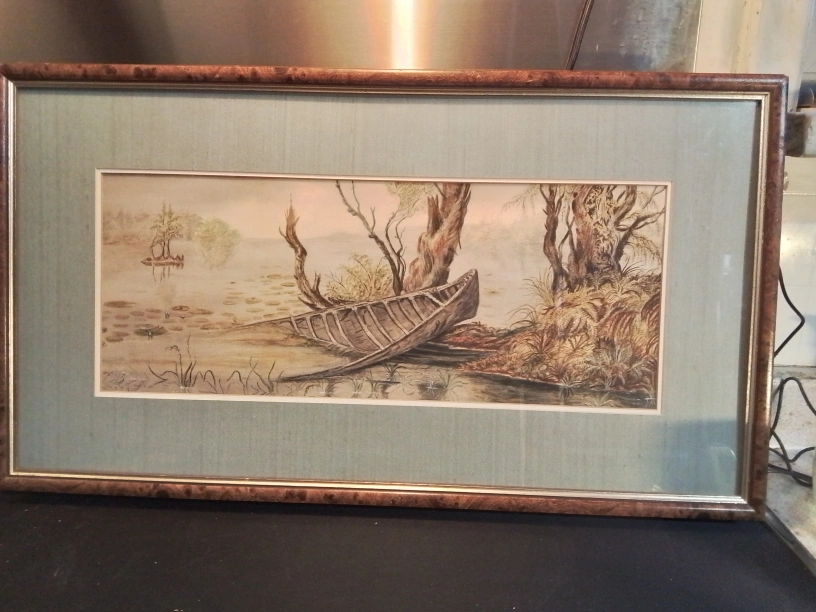 Watercolour painting, framed. Depicts a canoe resting on the bank of a lake or river. Trees and vegetation surround the water. Serene landscape. Beautiful colours and detail.