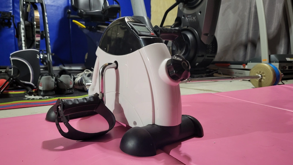 Portable mini exercise bike. Great for strengthening legs and improving circulation. Features a digital display showing time, distance, and calories burned. Compact and easy to store.