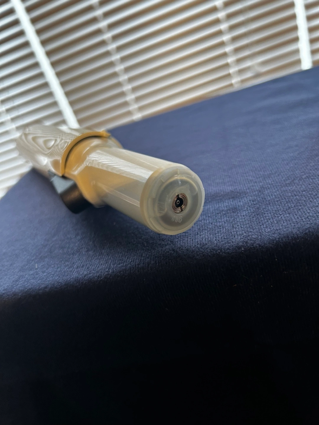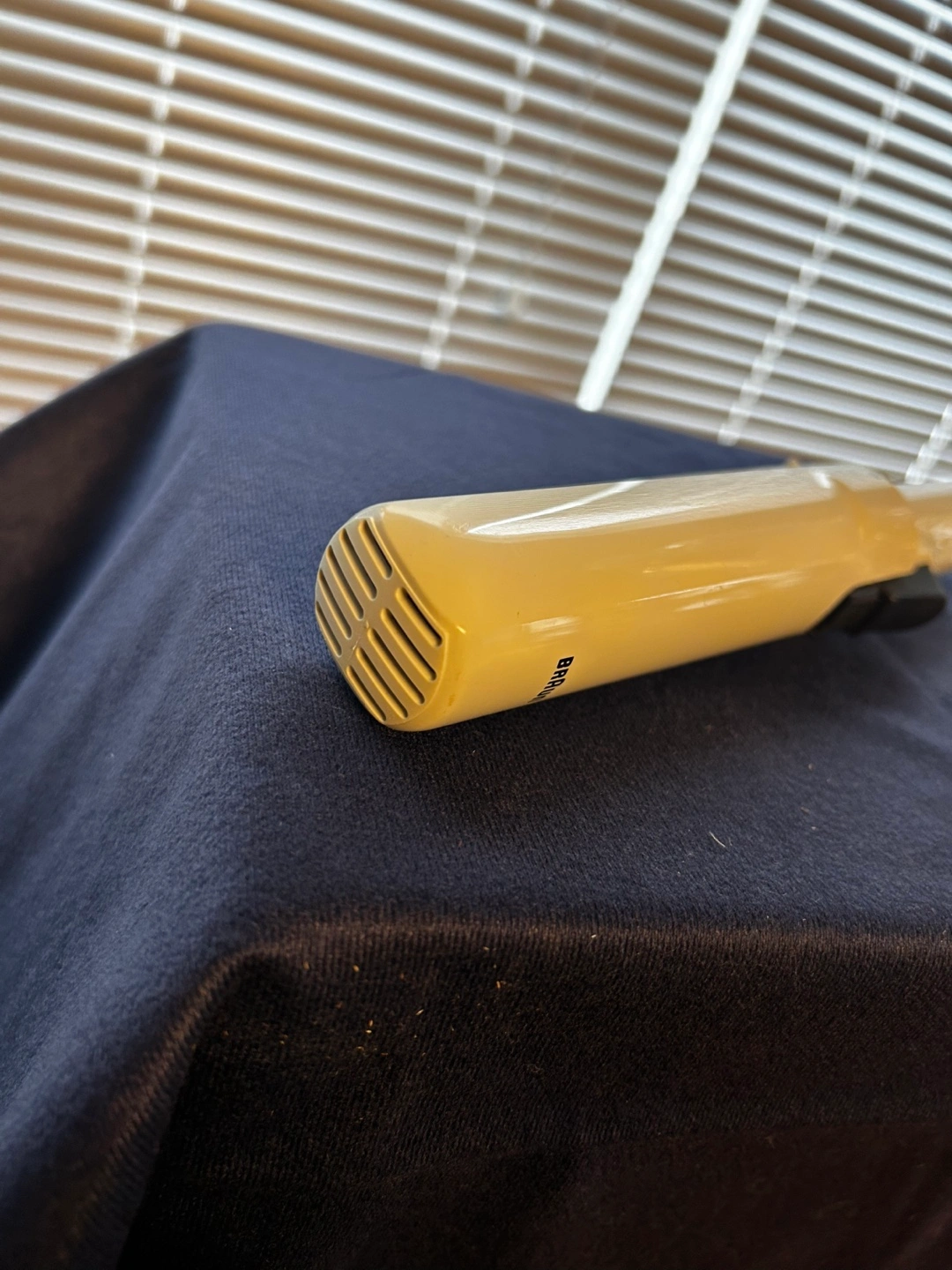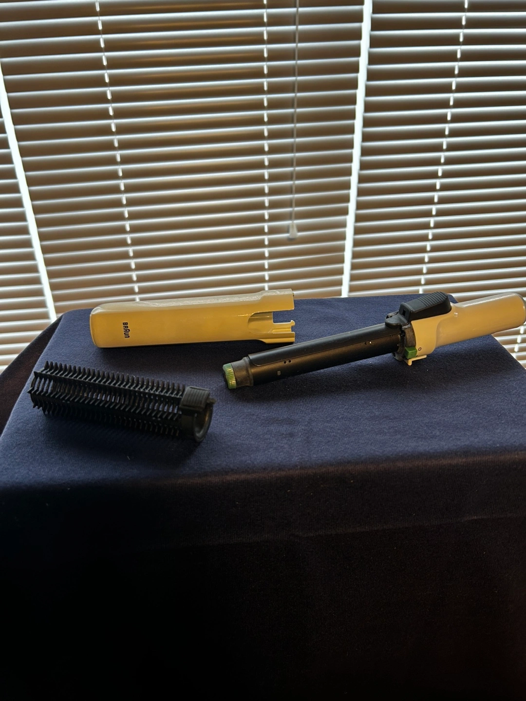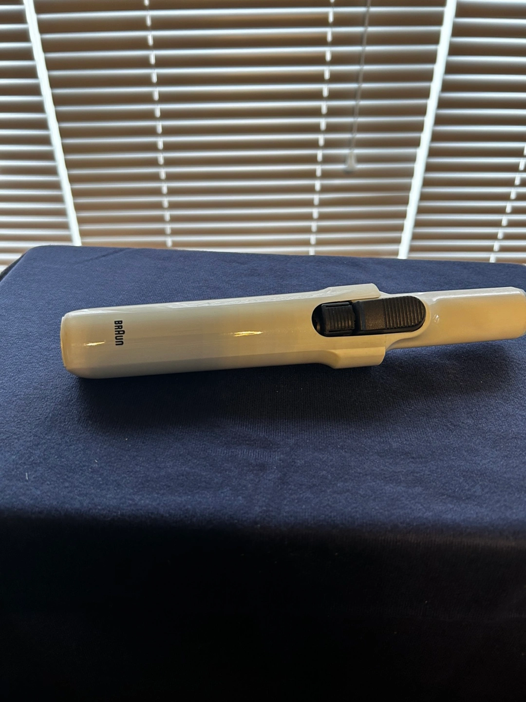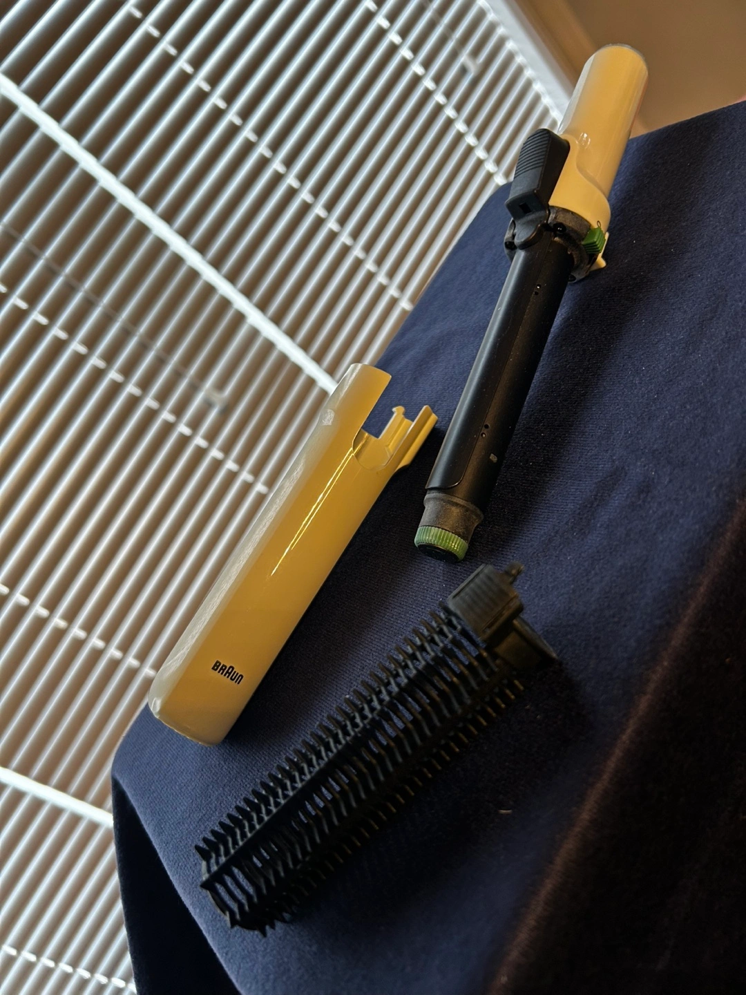 Vintage Braun Butane curling iron. Off-white colour. Parts are disassembled. Includes handle, barrel, and brush. Possible vintage collectible.