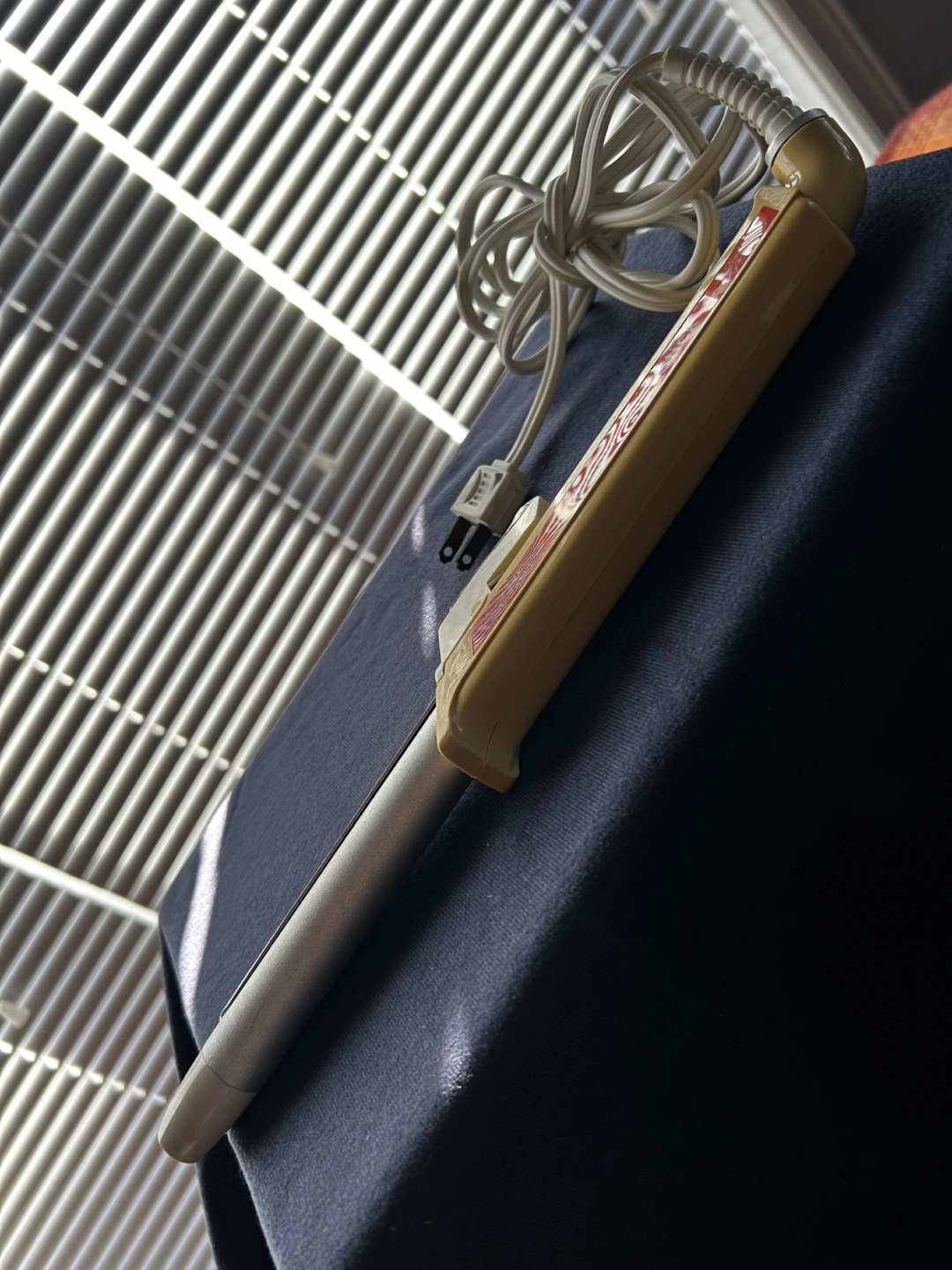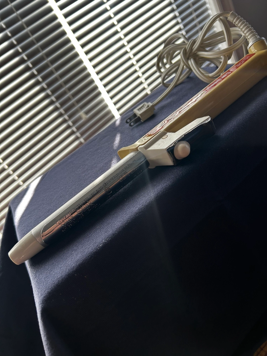 Vintage hair curling iron. Pale yellow and silver. Includes power cord. Used condition.