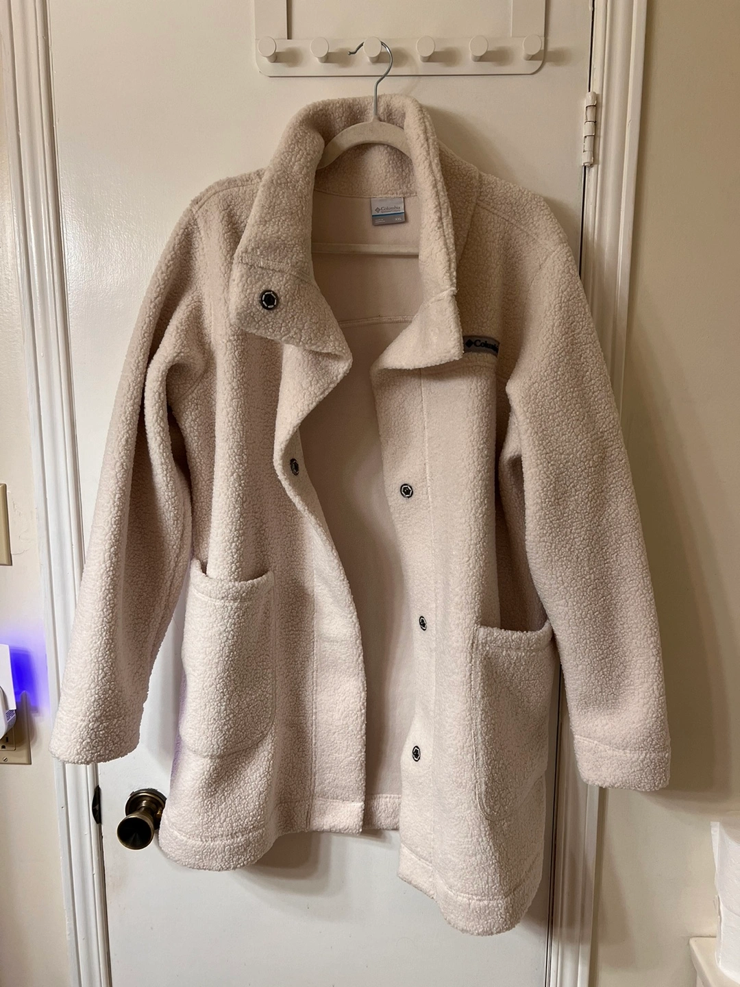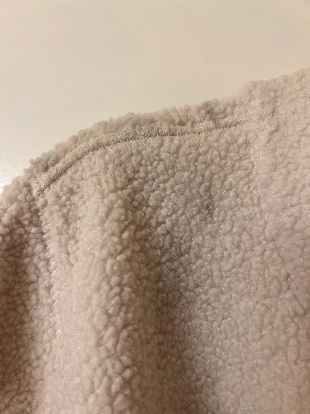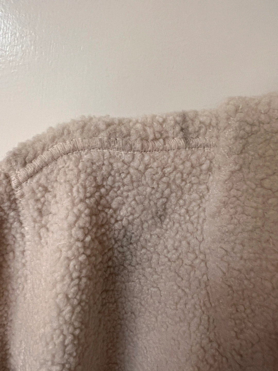 41Cream-coloured sherpa fleece jacket. Long sleeves, pockets, button closures. Size XXL. Made in Indonesia. Some dirt marks that can be washed, this jacket is machine washable. Pick up Dufferin and Clark