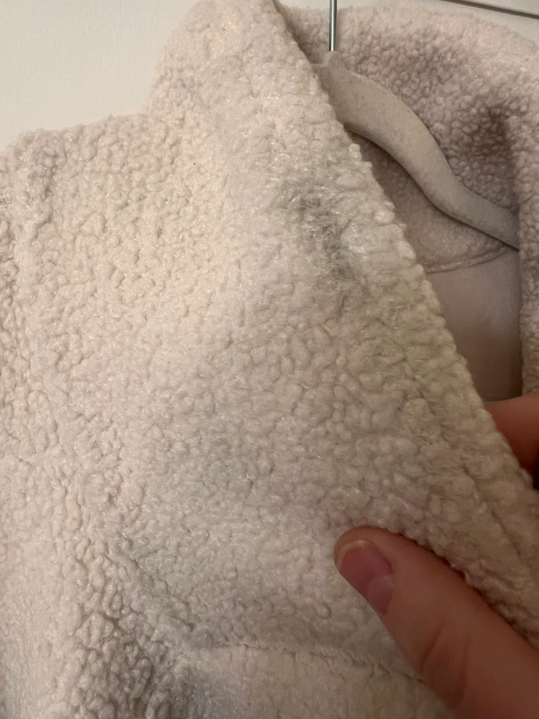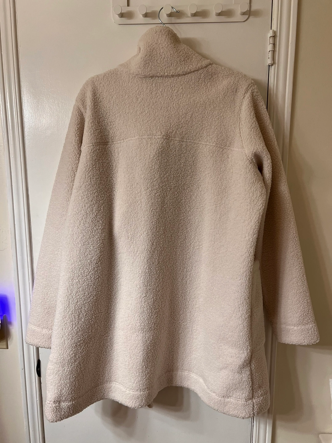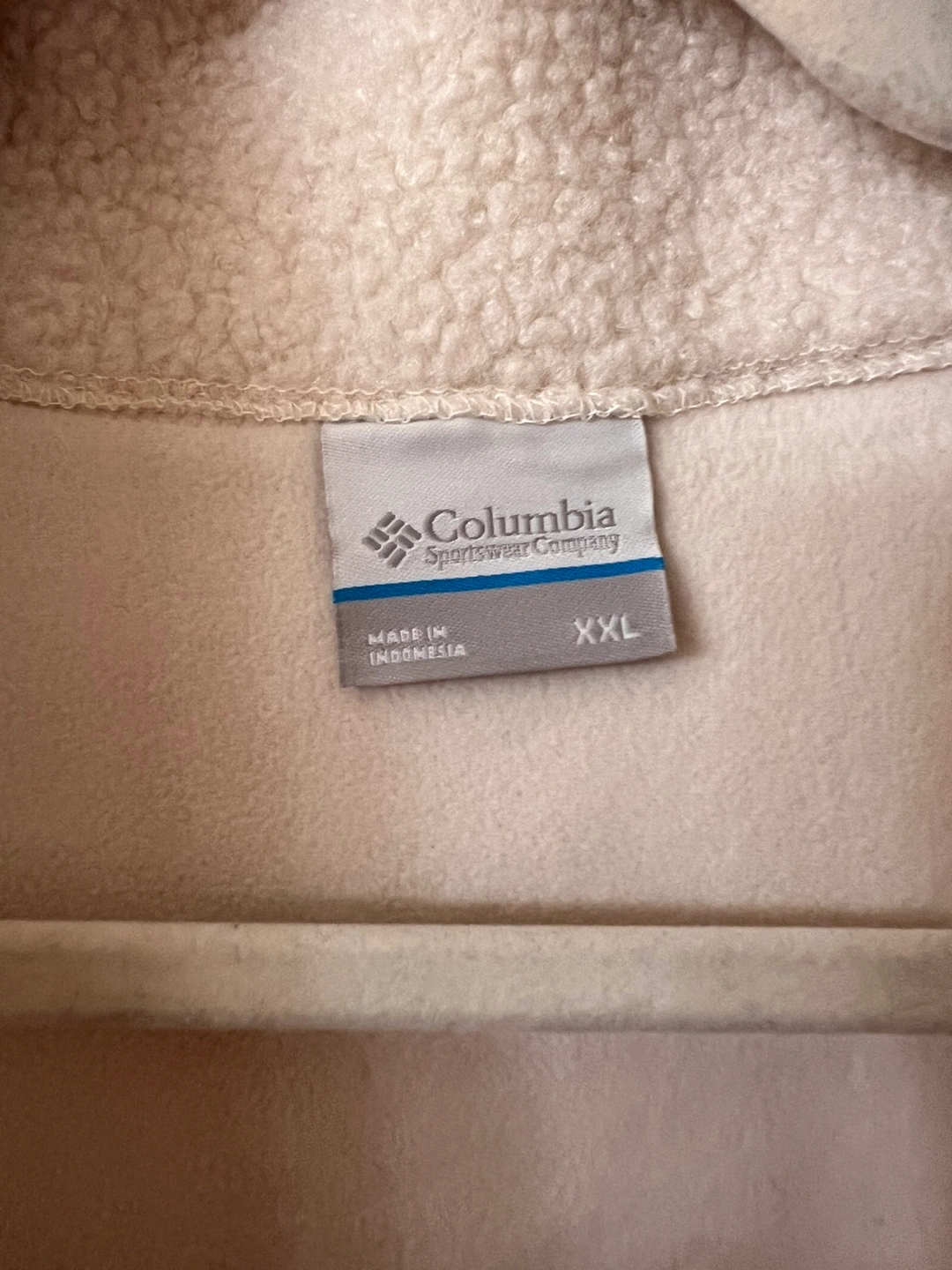 41Cream-coloured sherpa fleece jacket. Long sleeves, pockets, button closures. Size XXL. Made in Indonesia. Some dirt marks that can be washed, this jacket is machine washable. Pick up Dufferin and Clark