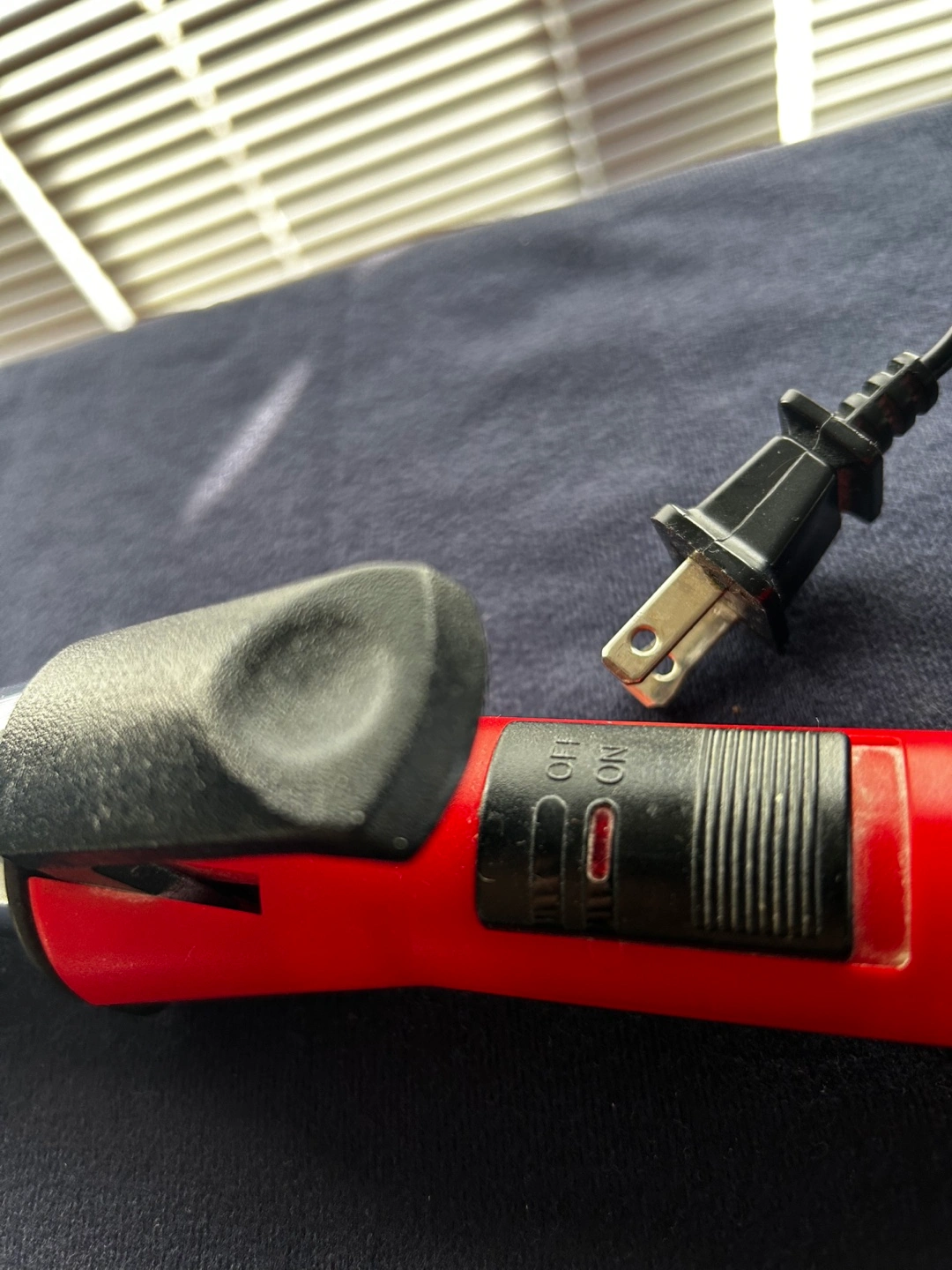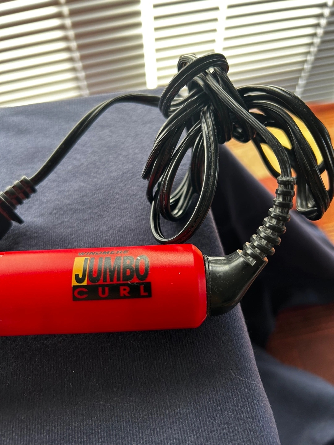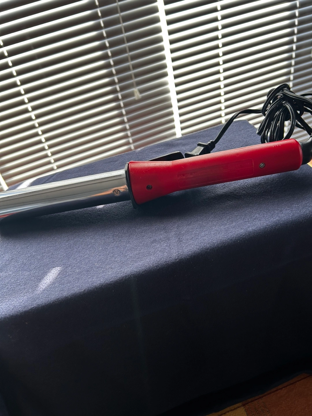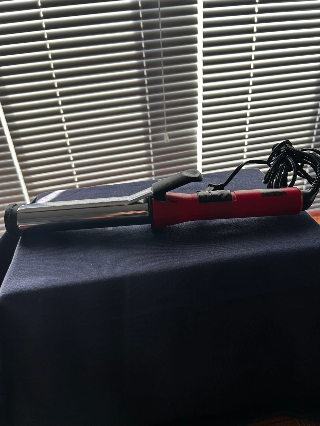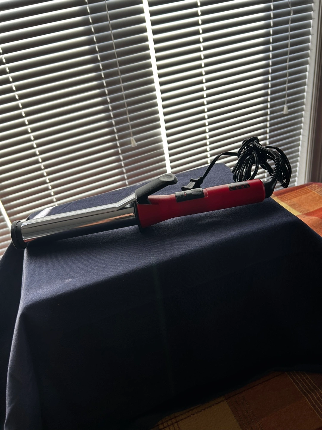 Red and silver jumbo curling iron. Features an on/off switch. Long cord. Used condition.