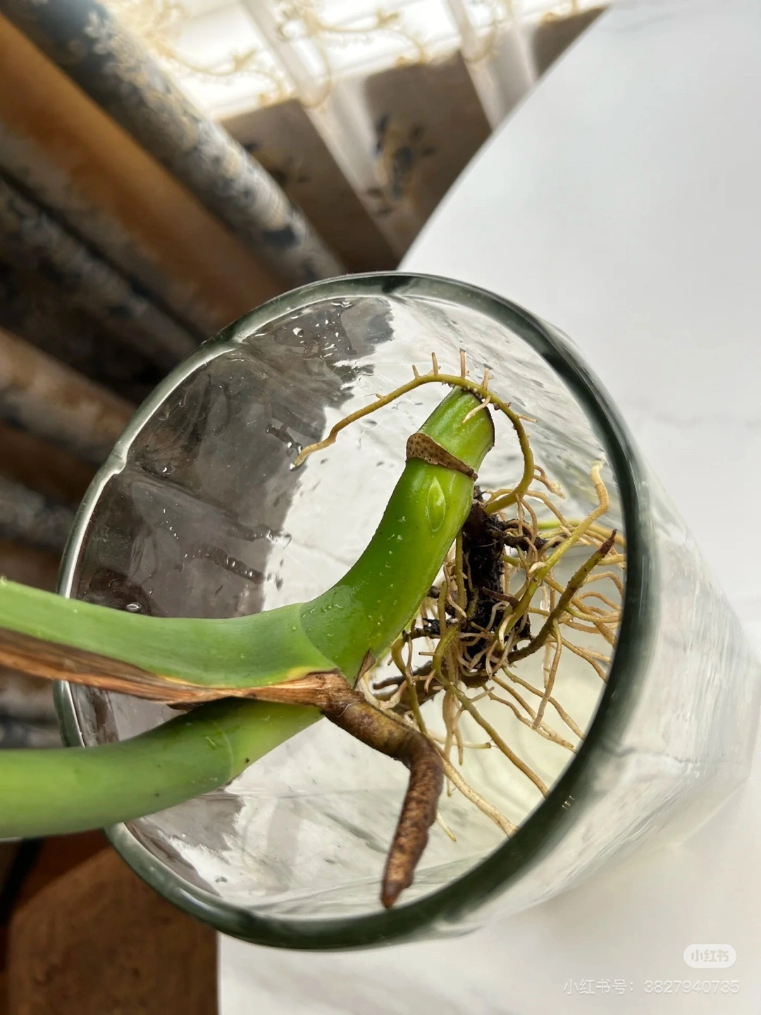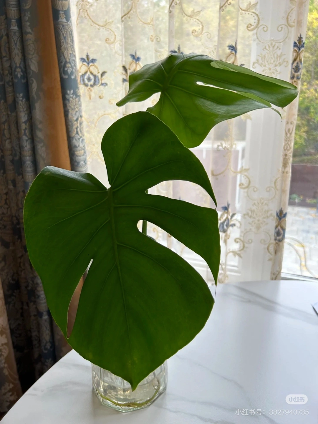 Healthy Monstera deliciosa cutting in water. Two large leaves. Ready to plant.