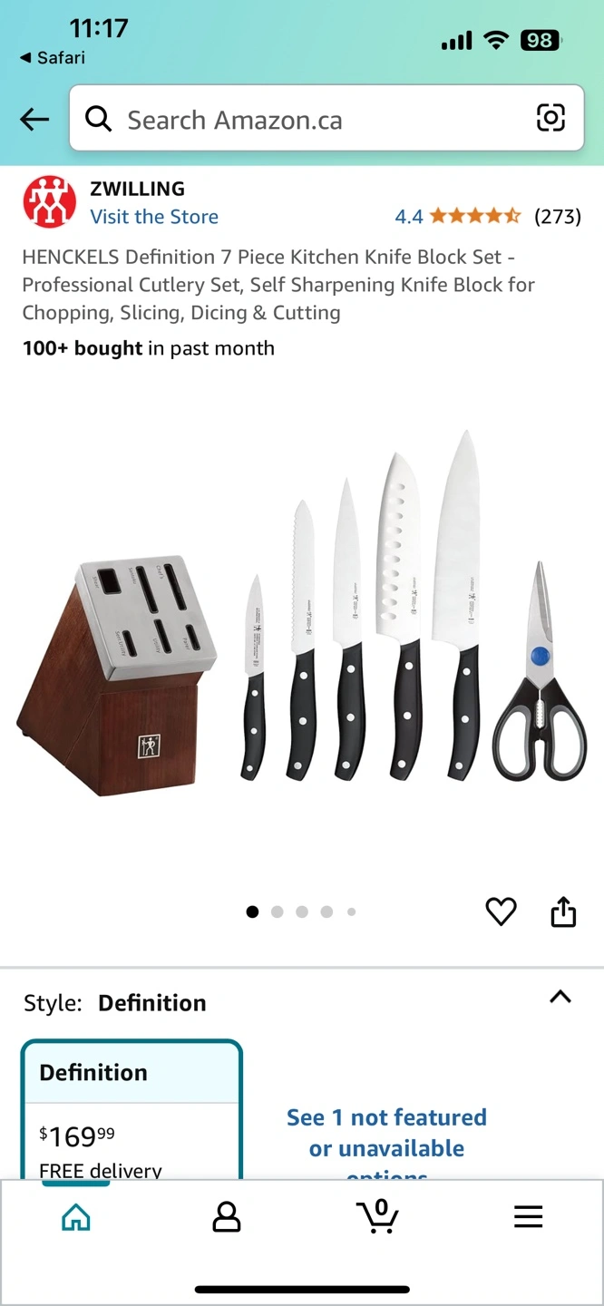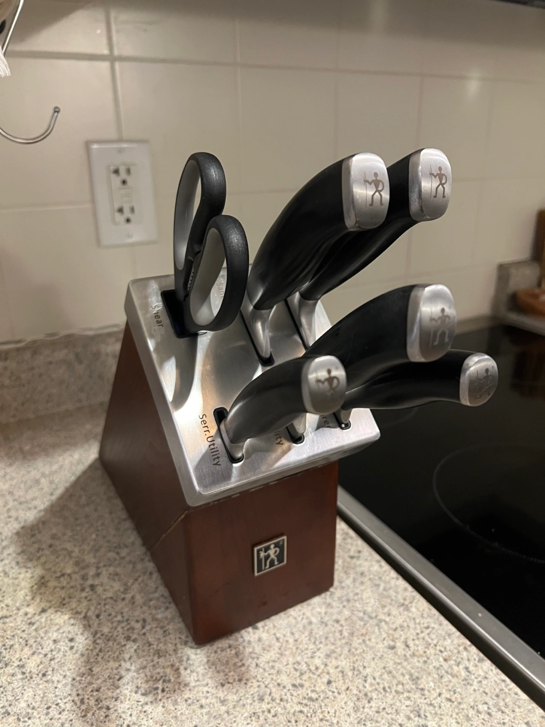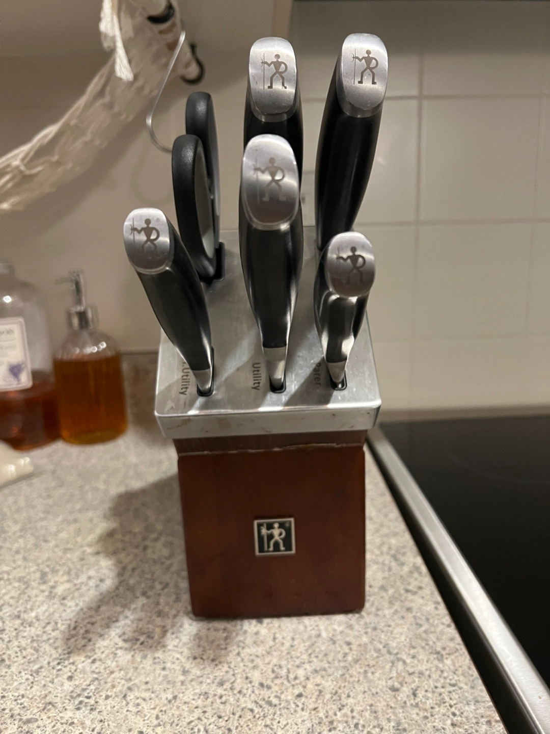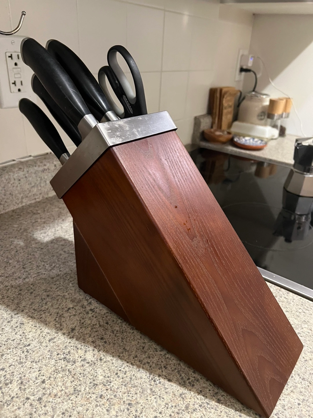 Stylish ash wood base, self-sharpening slots that sharpen each time a knife is removed or replaced. Labeled slots guide proper placement. Used but in excellent condition, retails for $170 pre-tax.