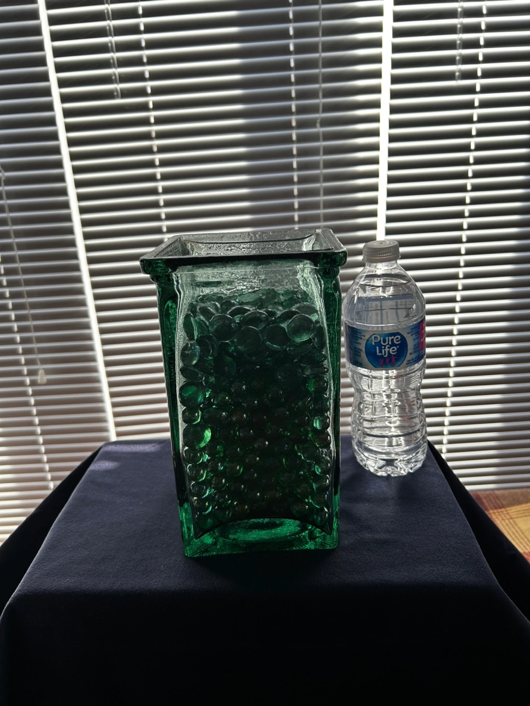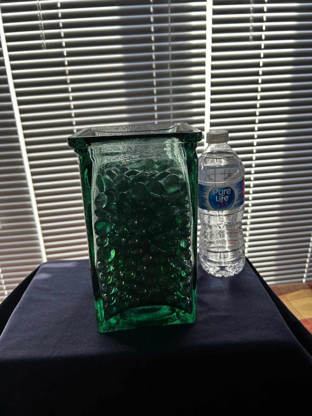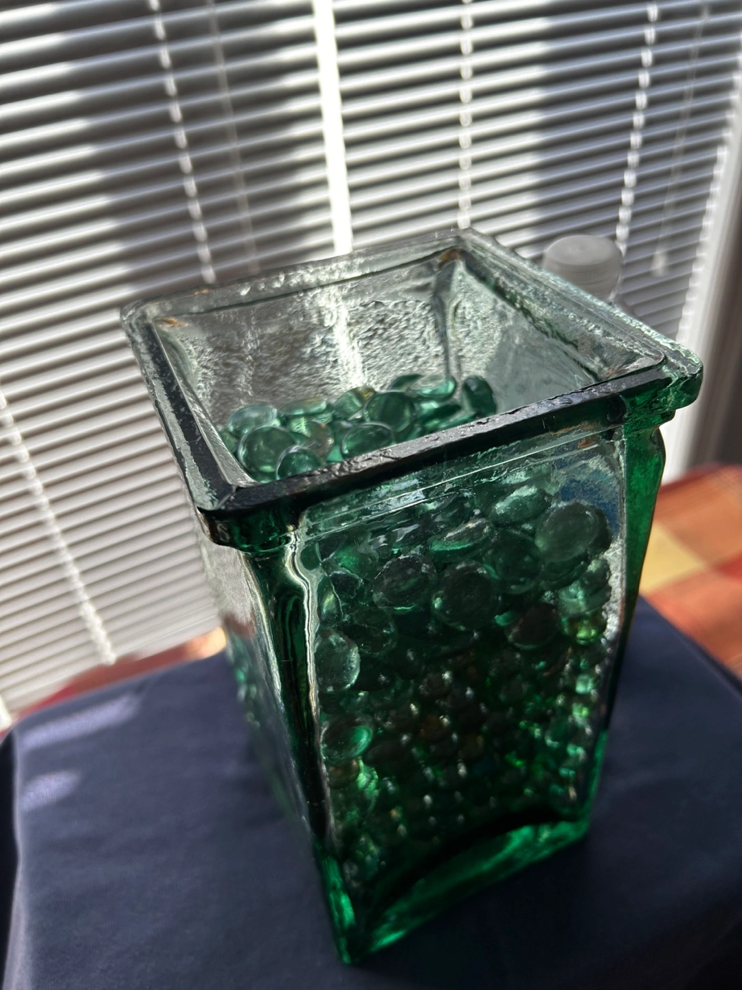 Square green glass vase. Contains decorative green glass stones. Unique design. Perfect for home decor.