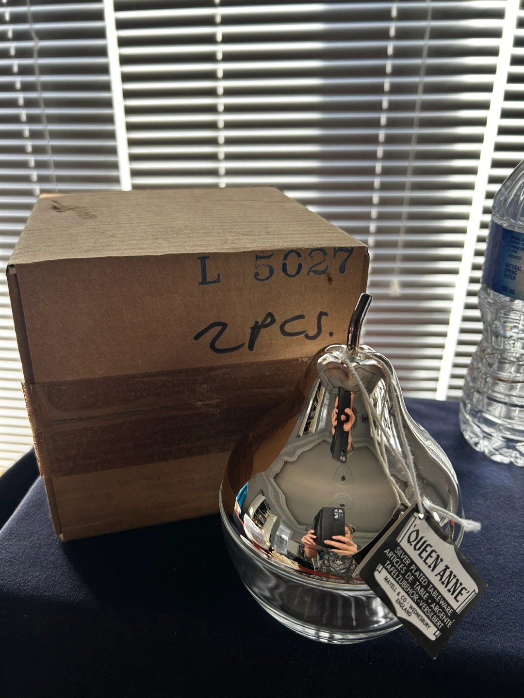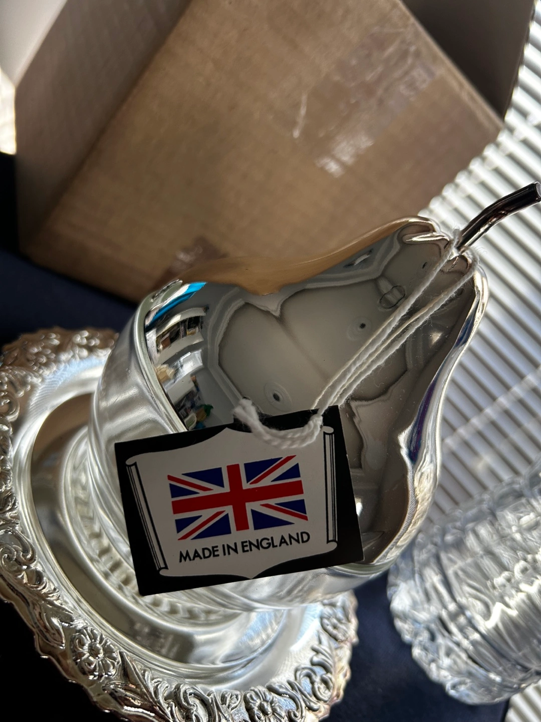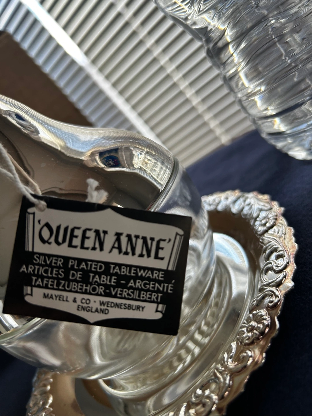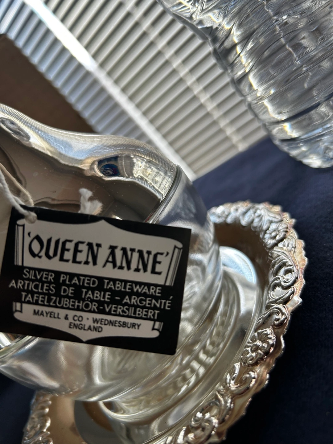 Elegant vintage Queen Anne silver plated sugar bowl.Features a pear-shaped glass container and ornate silver plated base. Made in England by Mayell & Co. Wednesbury. Comes in original packaging.