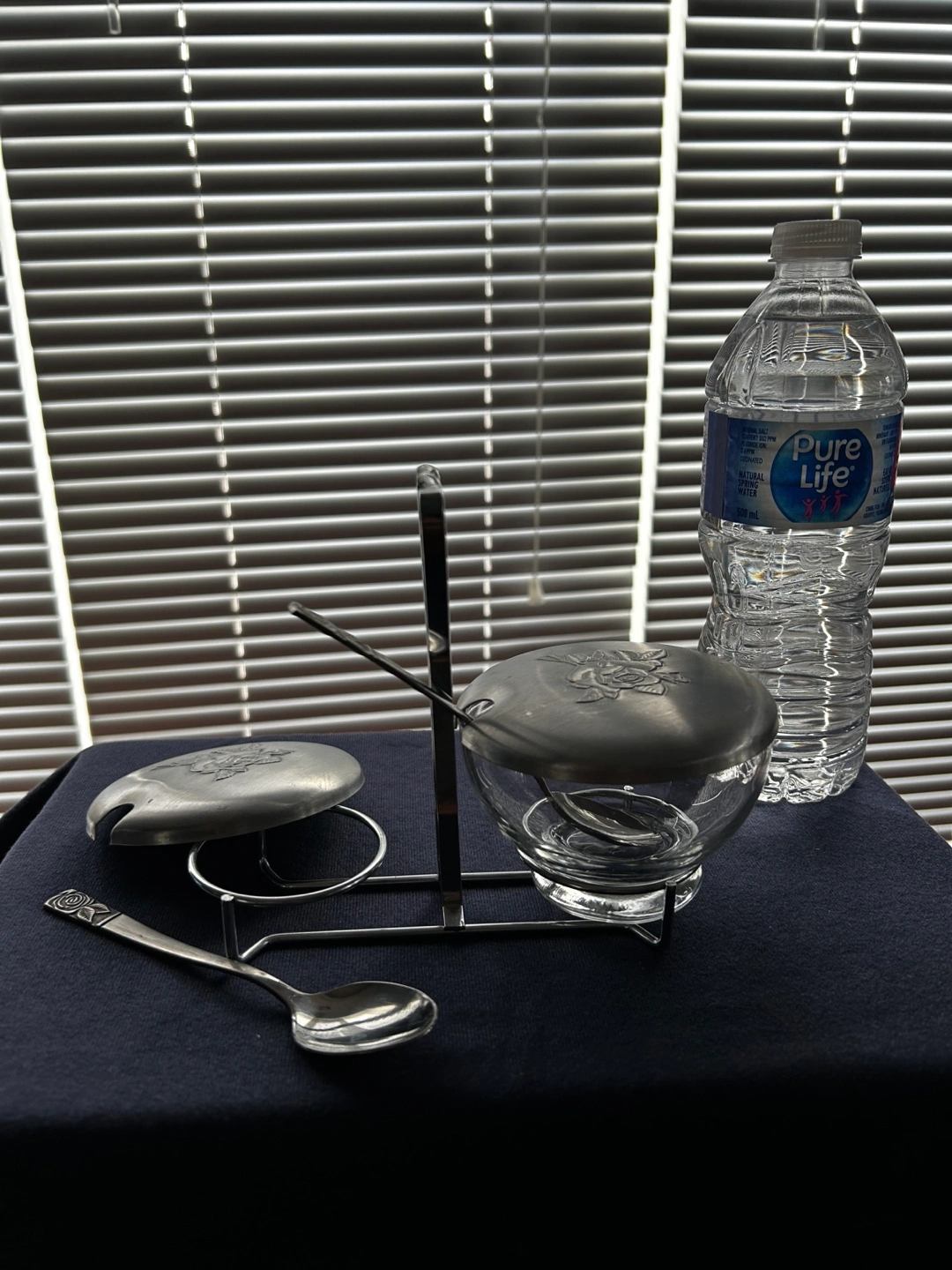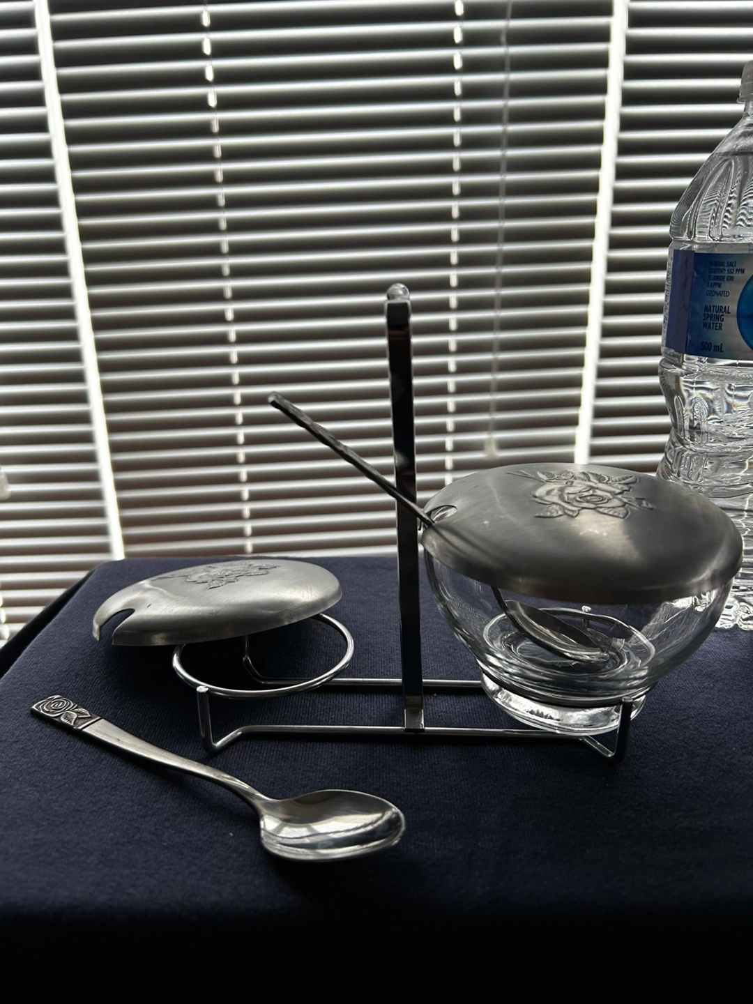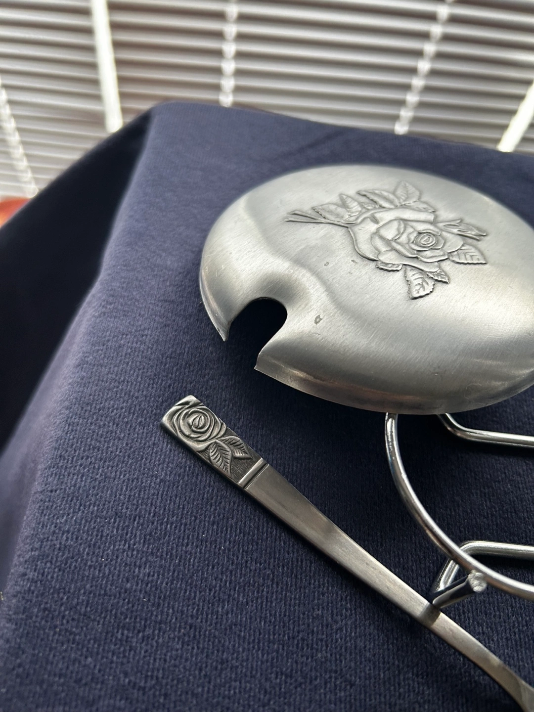 Silver-toned metal sugar bowl and creamer set. Features a rose design. Includes two spoons and a stand. Vintage.