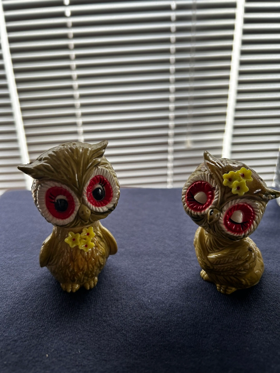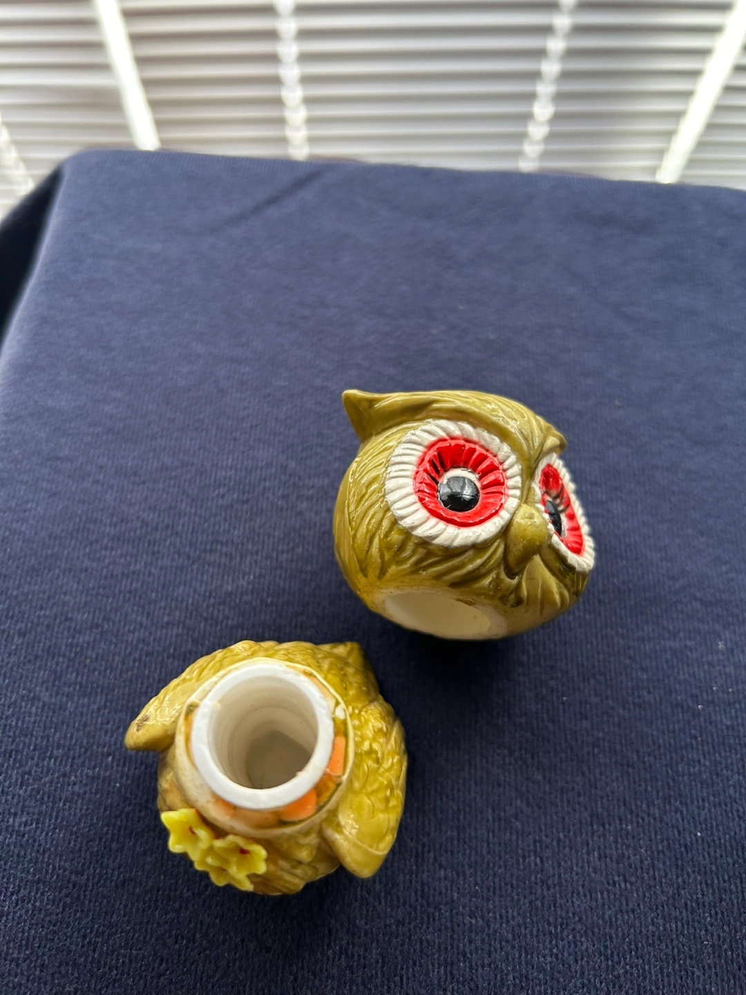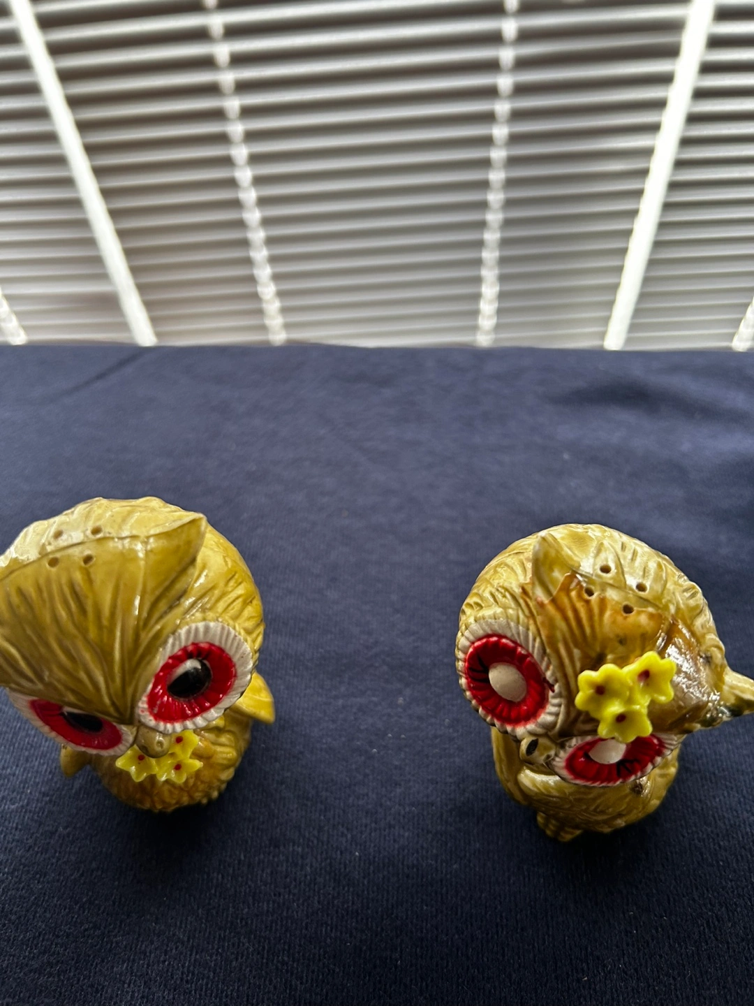 Adorable vintage owl salt and pepper shakers. Olive green ceramic owls with red and white eyes. Small yellow flowers accent each owl. Collectible kitchen decor.