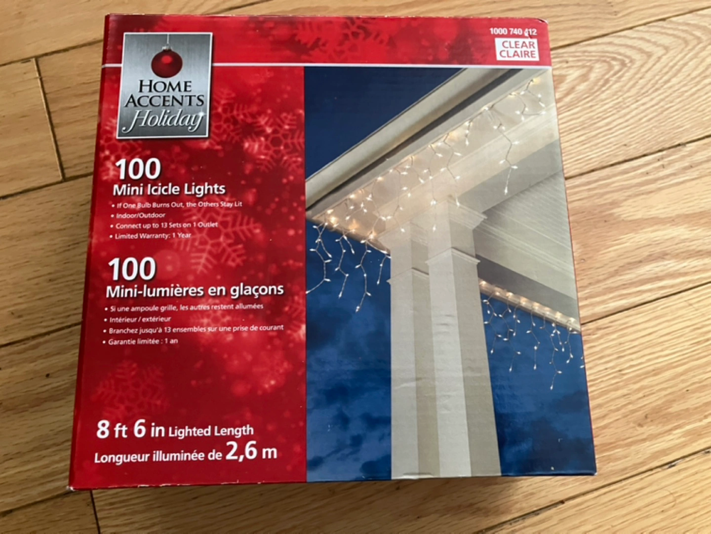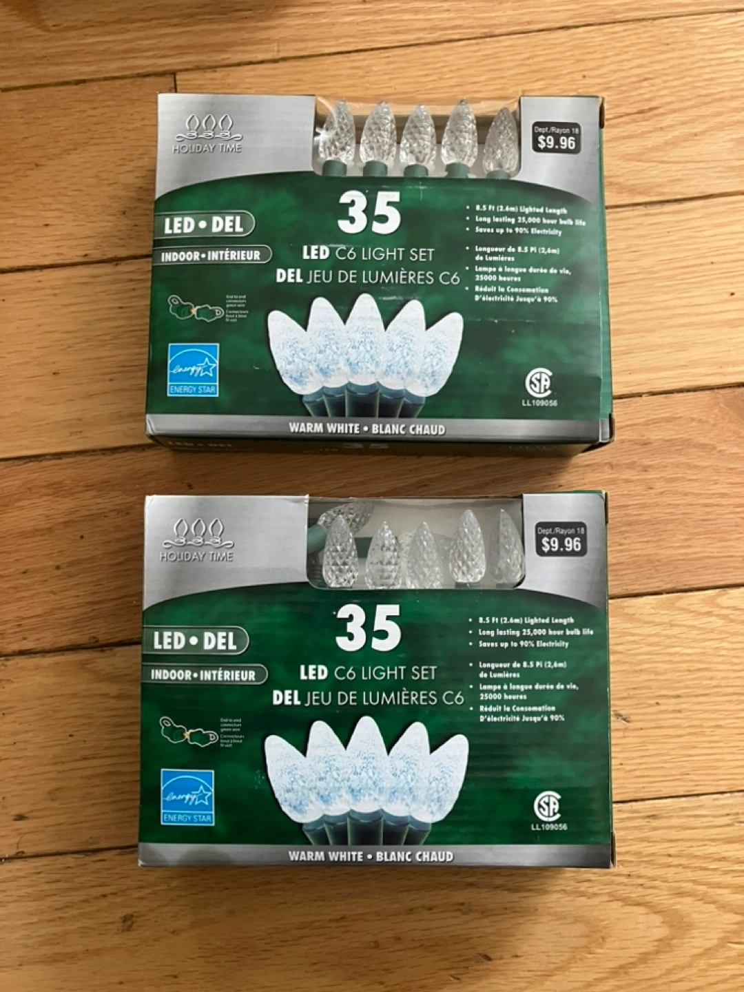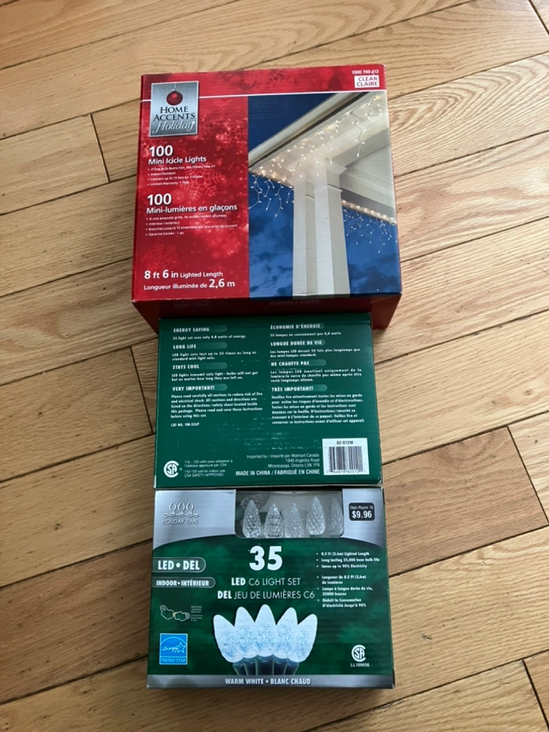 Two boxes of Holiday Time LED C6 light sets, 35 lights each. Warm white. One box of Home Accents Holiday mini icicle lights, 100 lights. 8 feet 6 inches of lighted length.