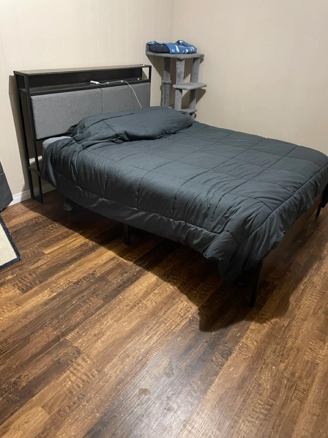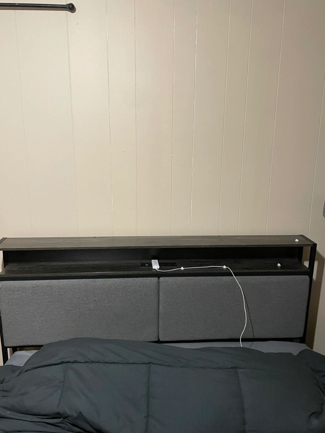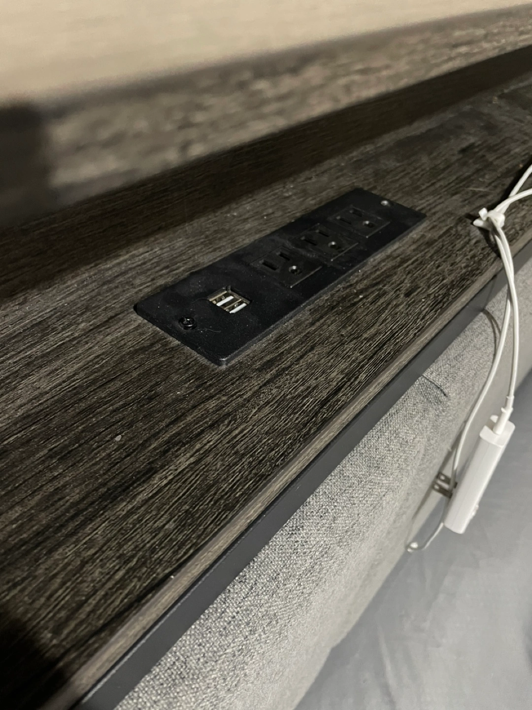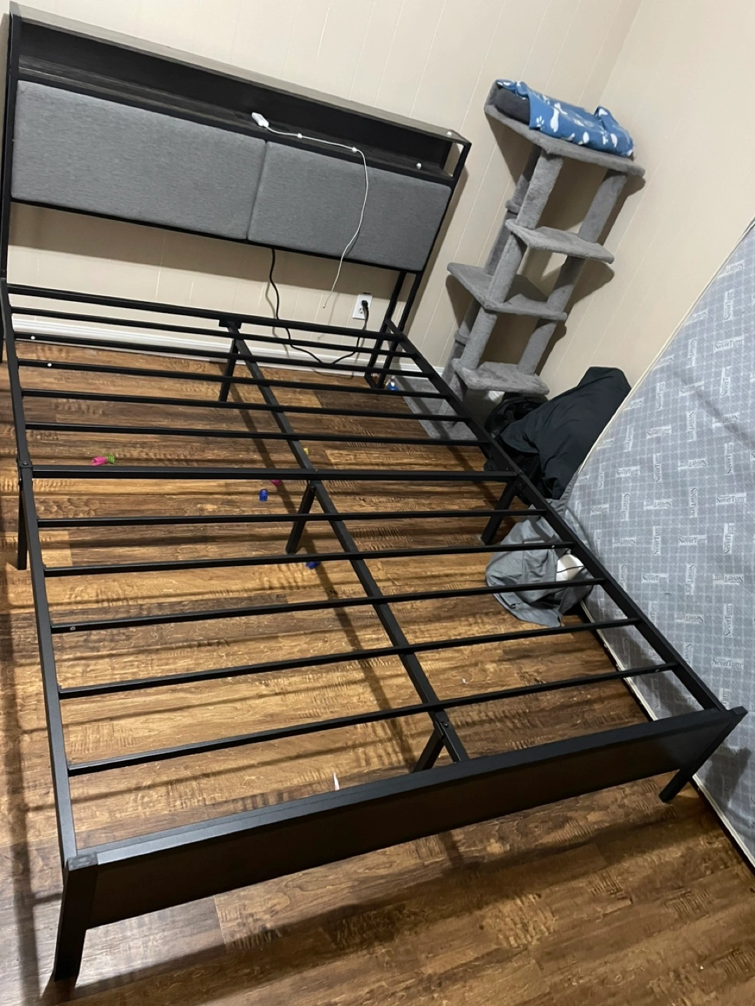 Queen size metal platform bed frame. Features a built-in headboard shelf with USB and electrical outlets. Grey fabric headboard. Some minor wear and tear. 1 Month old