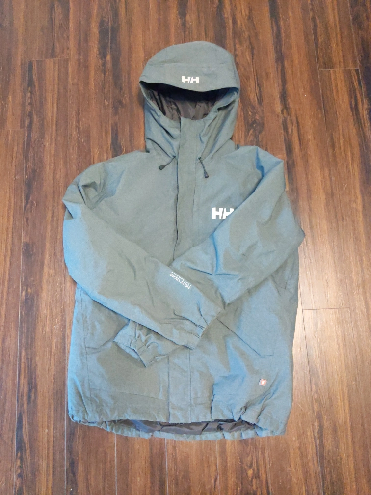 size large, charcoal grey, very gently worn (only a couple times). lots of zippers, including under armpits for airflow. adjustable hood and waist to keep the cold out.