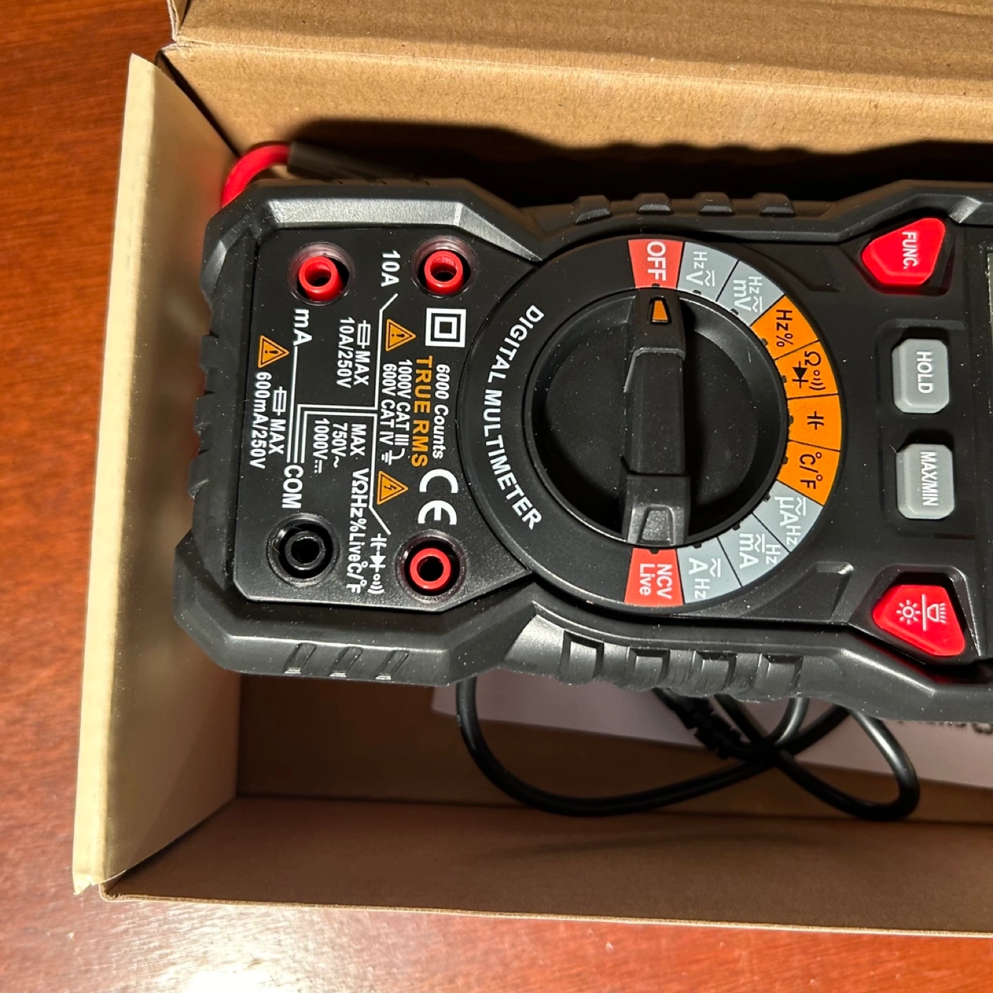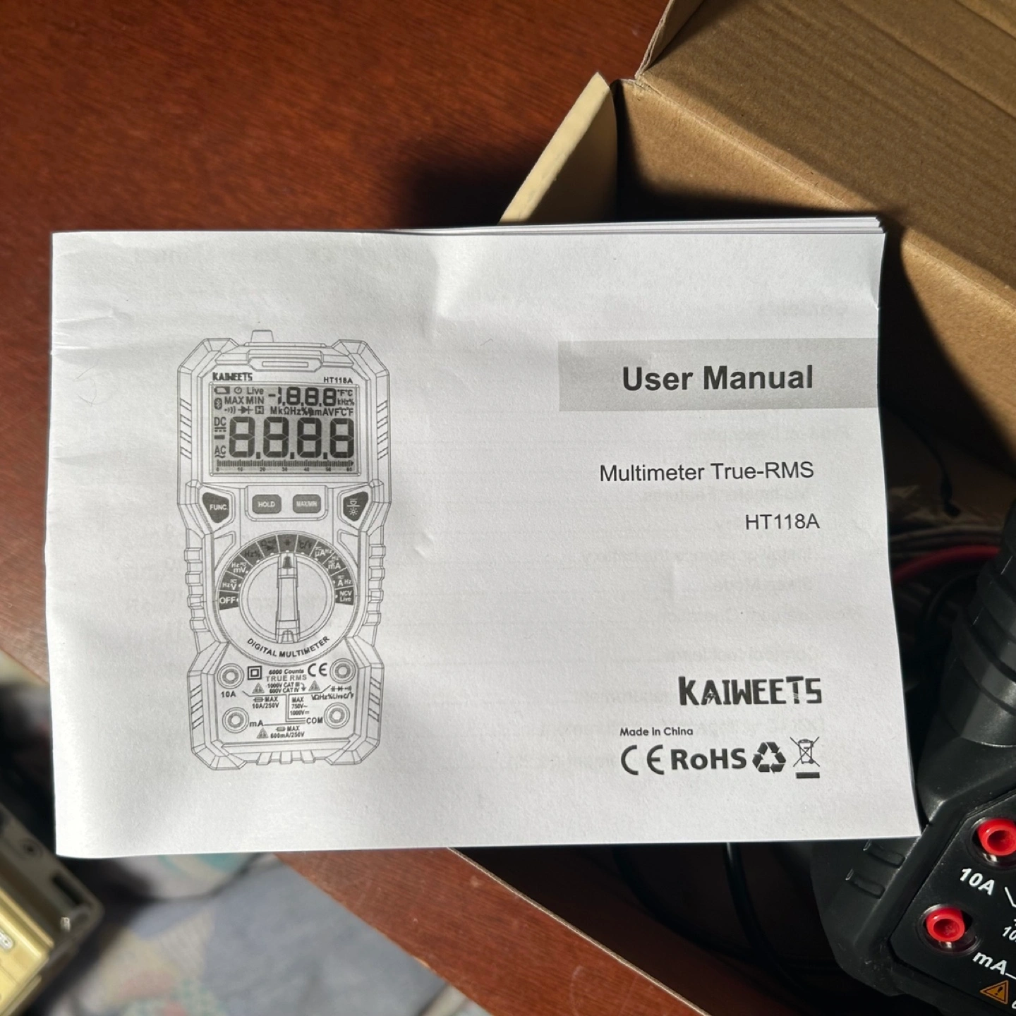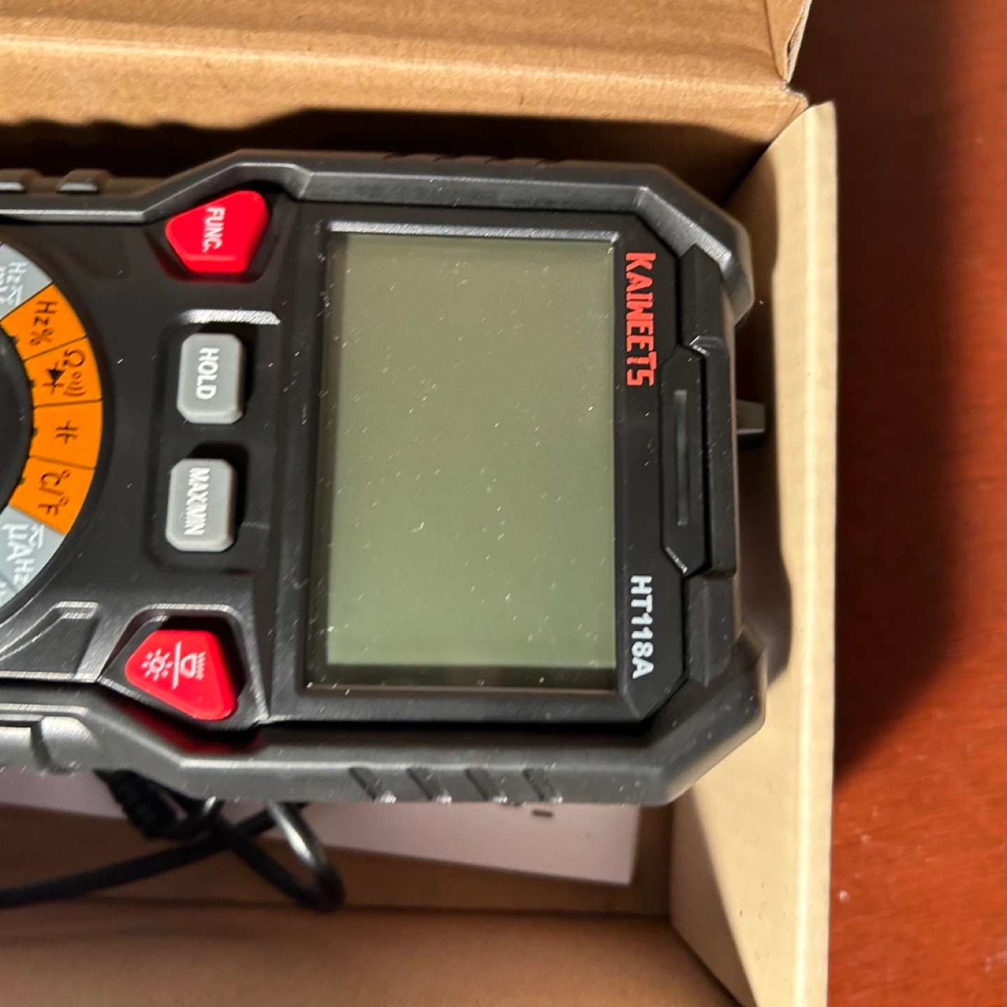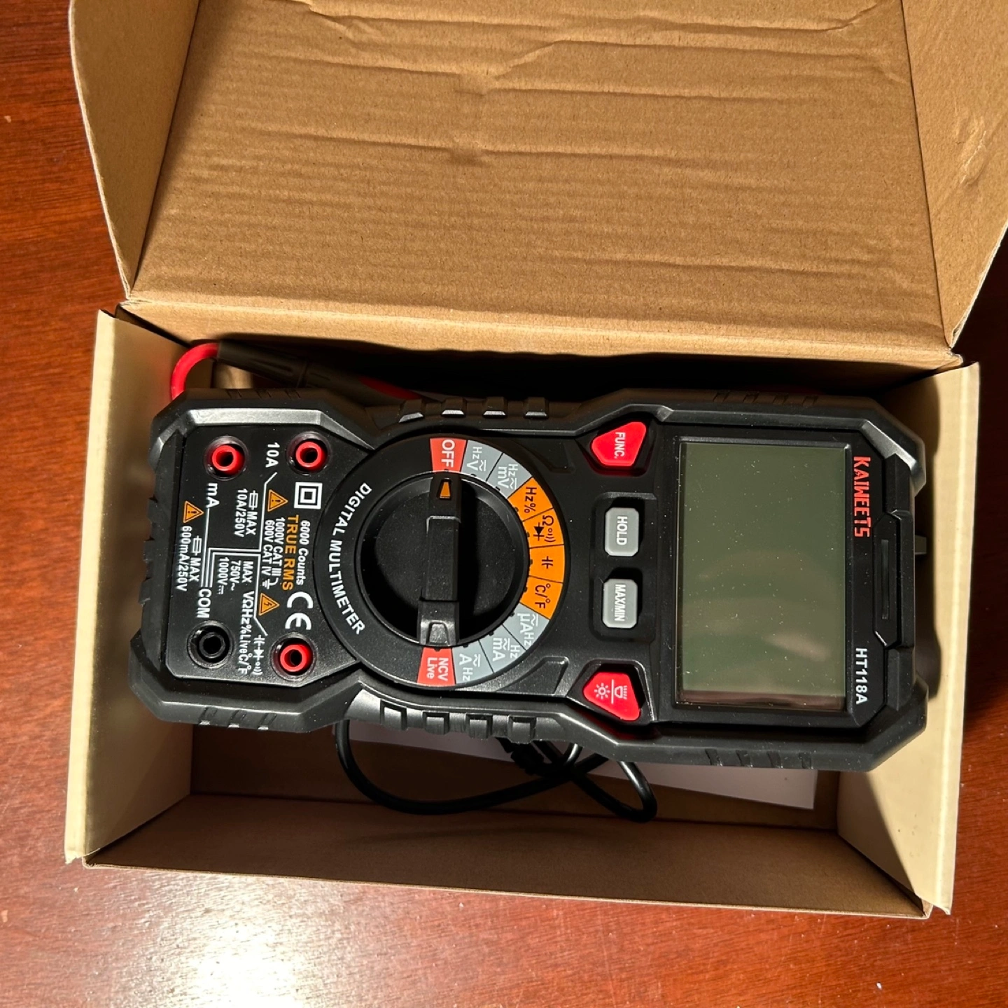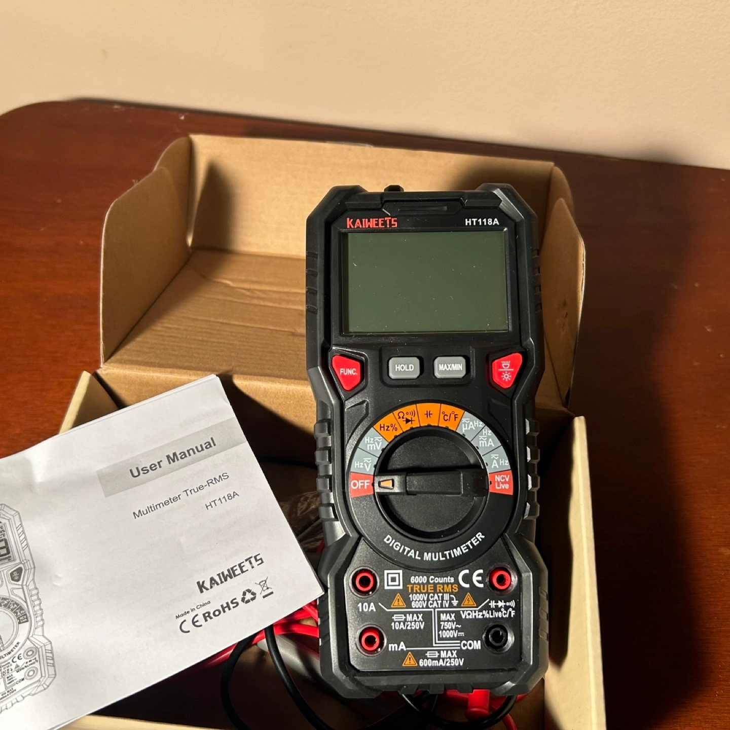 Brand new Kaiweets HT118A digital multimeter. True RMS, 6000 counts. Includes test leads and user manual. Compact and portable design.