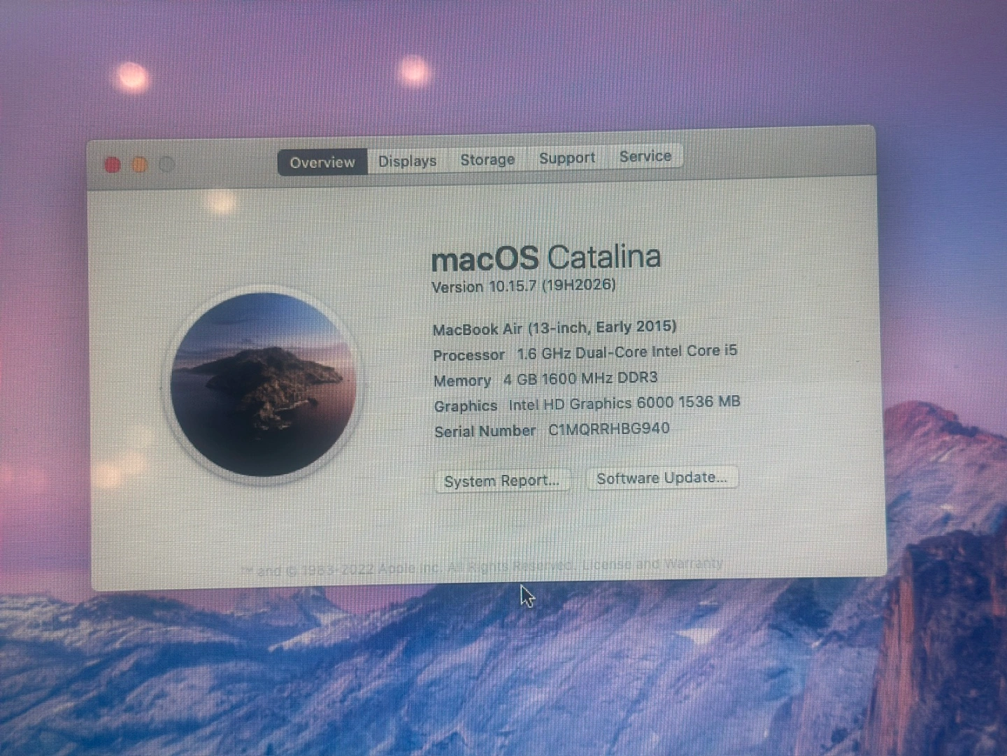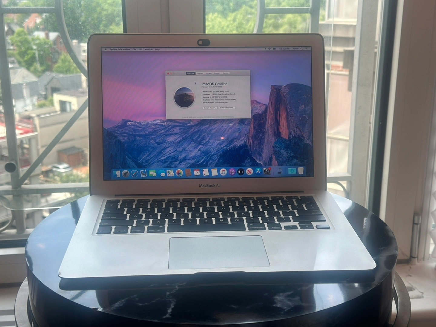 13-inch MacBook Air, Early 2015 model. macOS Catalina installed. 1.6 GHz Dual-Core Intel i5 processor. 4 GB memory. Intel HD Graphics 6000. Good working condition. Charger included