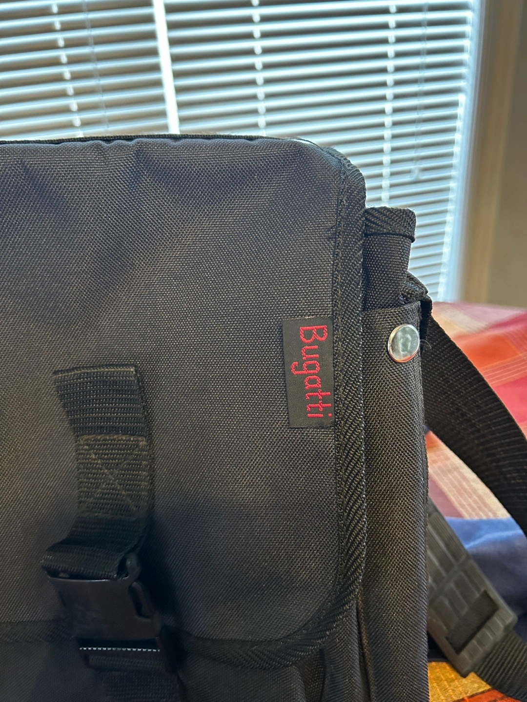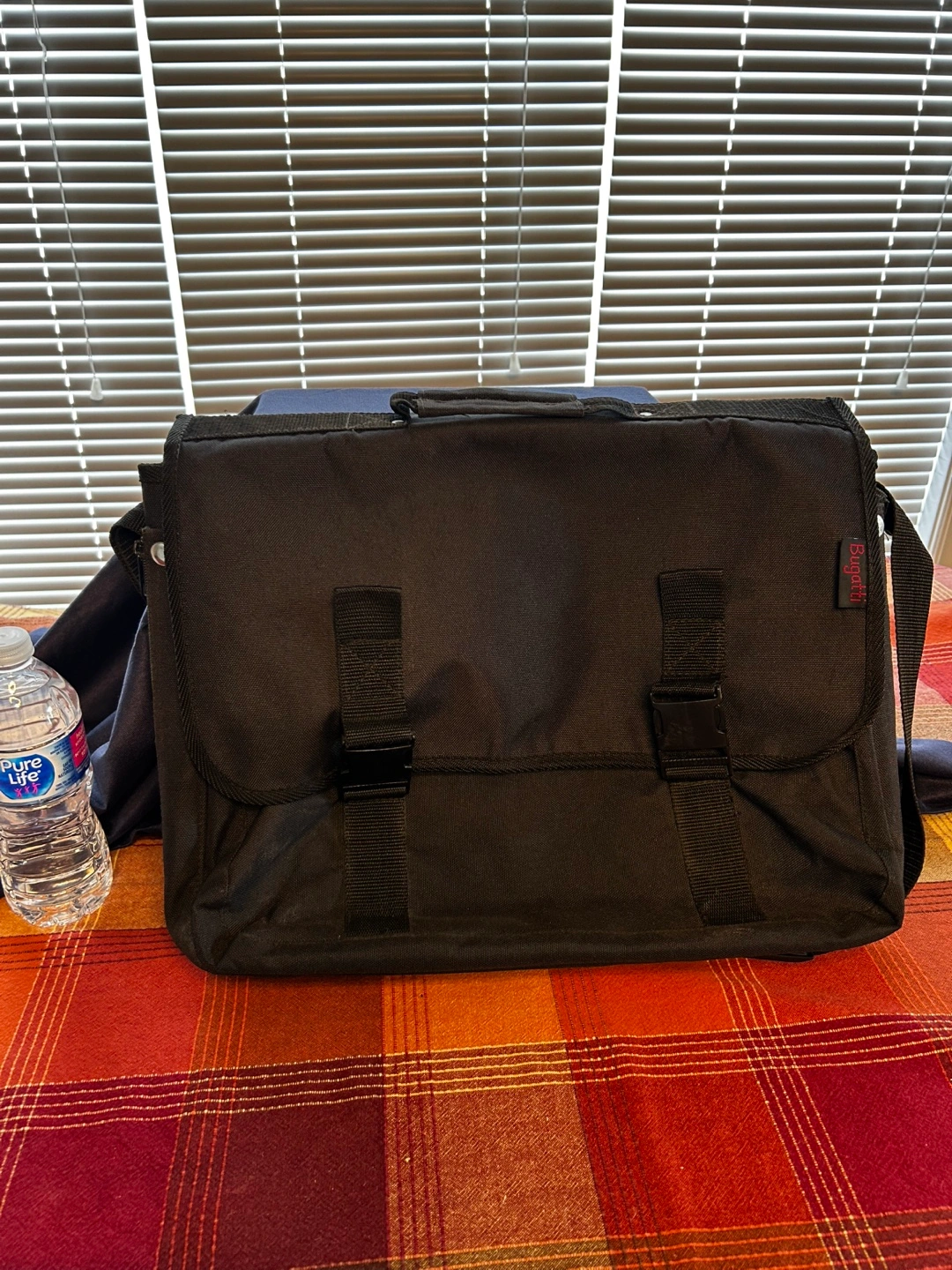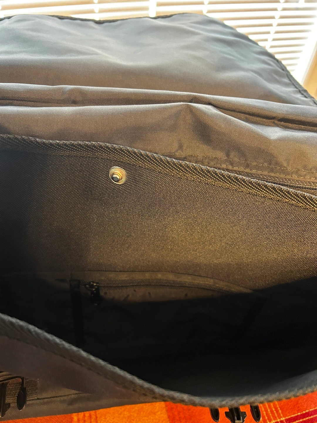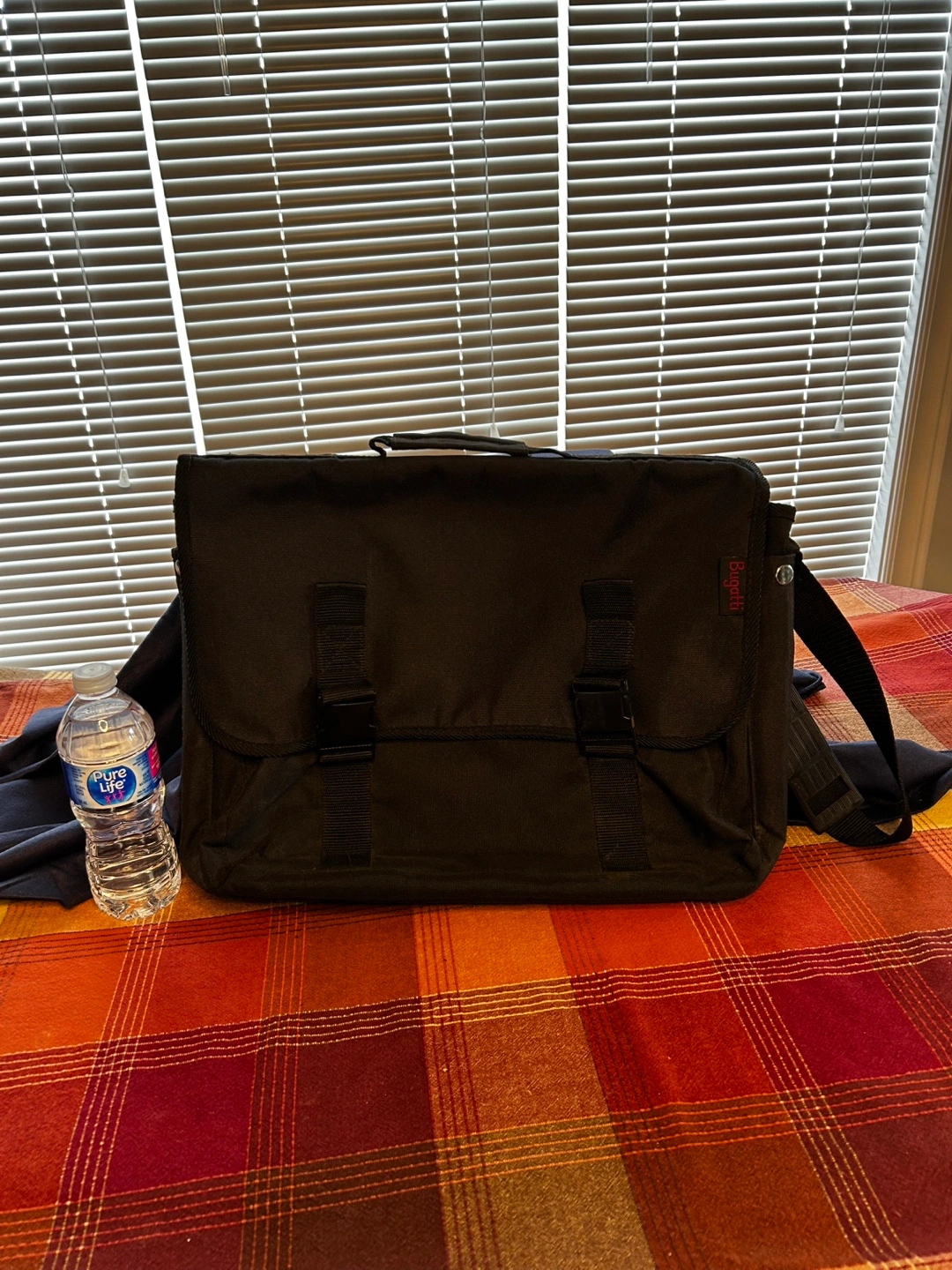Black messenger bag. Features adjustable shoulder strap and multiple compartments. Good for everyday use or travel.