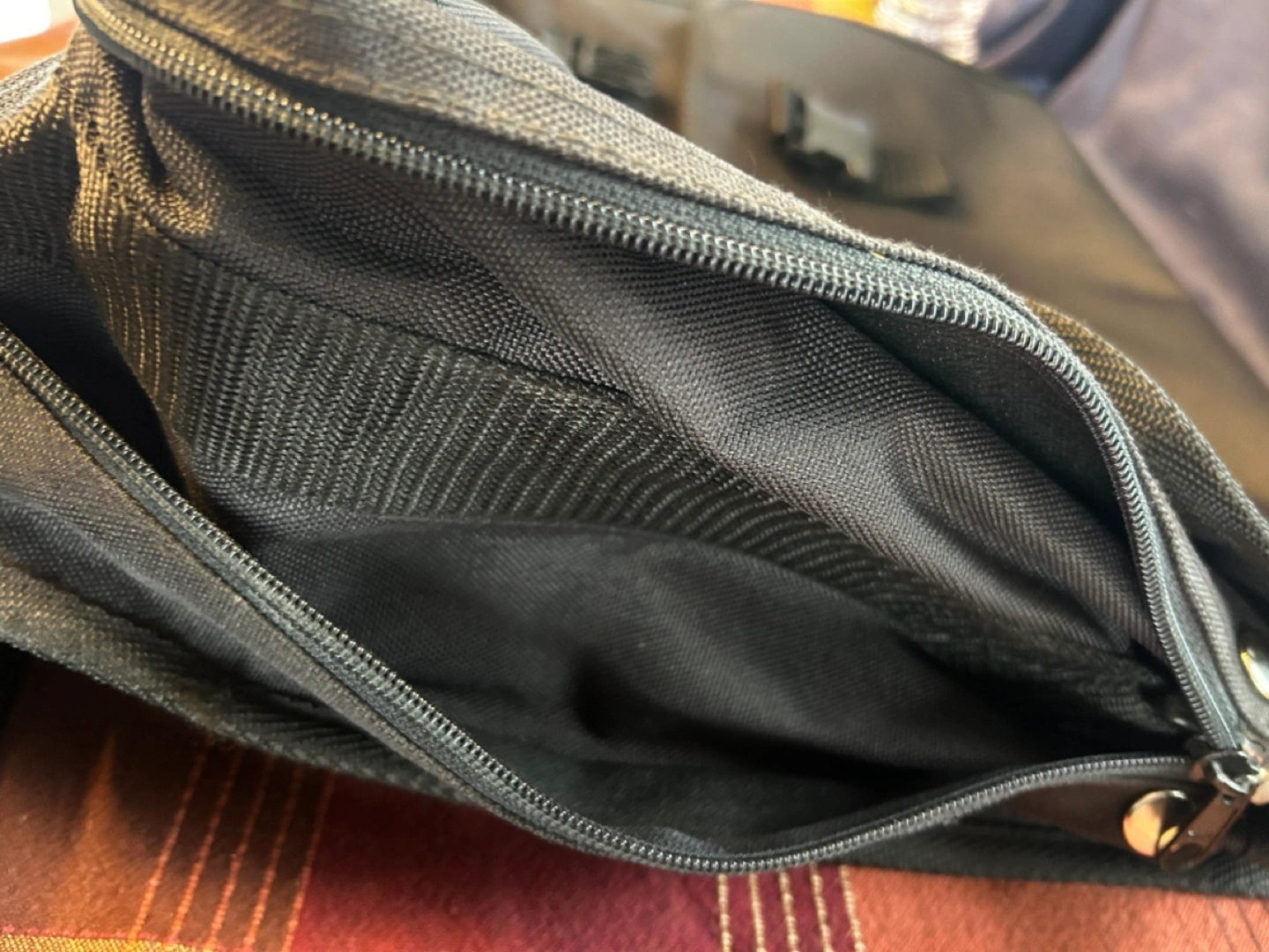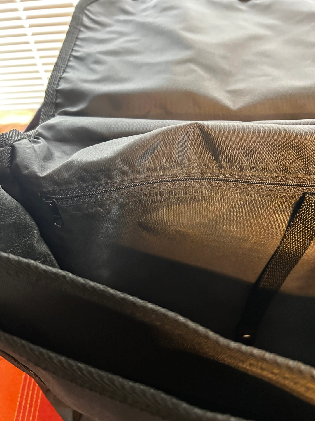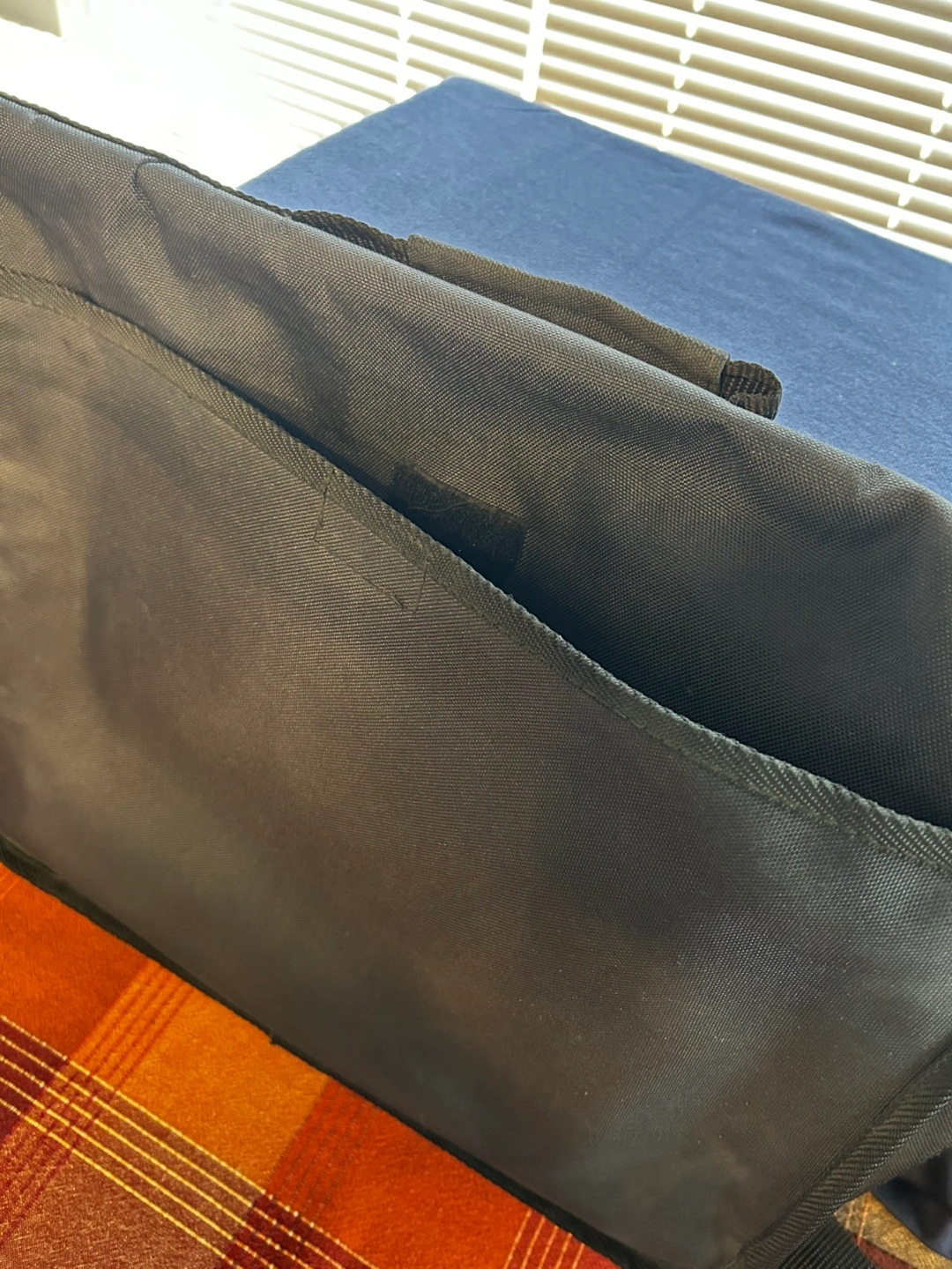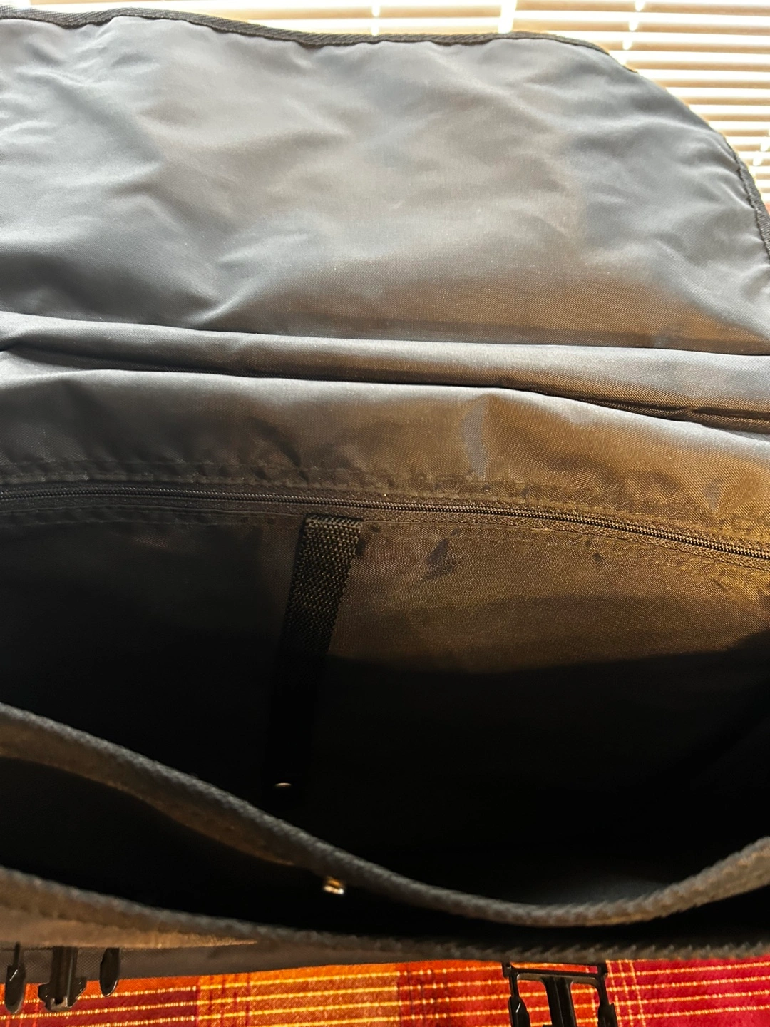 Black messenger bag. Features adjustable shoulder strap and multiple compartments. Good for everyday use or travel.