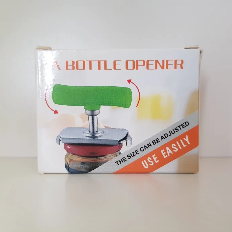 1000+Easy-to-use bottle and jar opener. Adjustable size. Green handle. New in box. Simple instructions on box. Pickup only (near or at Cornell Public Library)