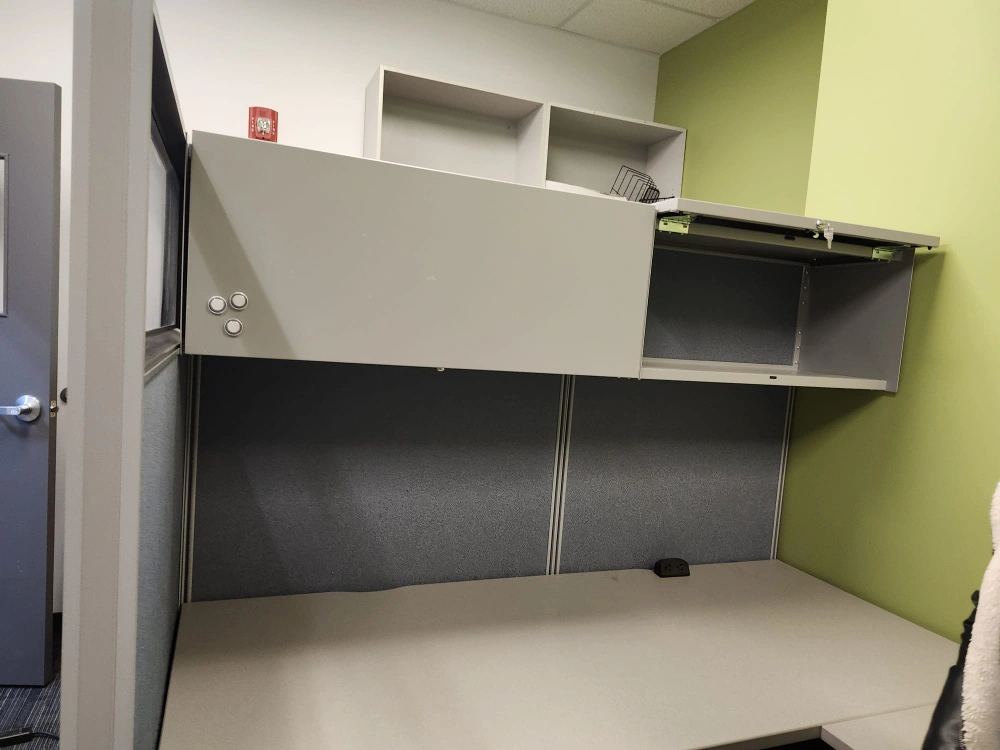 Grey cubicle workstation. Includes overhead storage cabinets and a grey fabric partition. Good for office use.