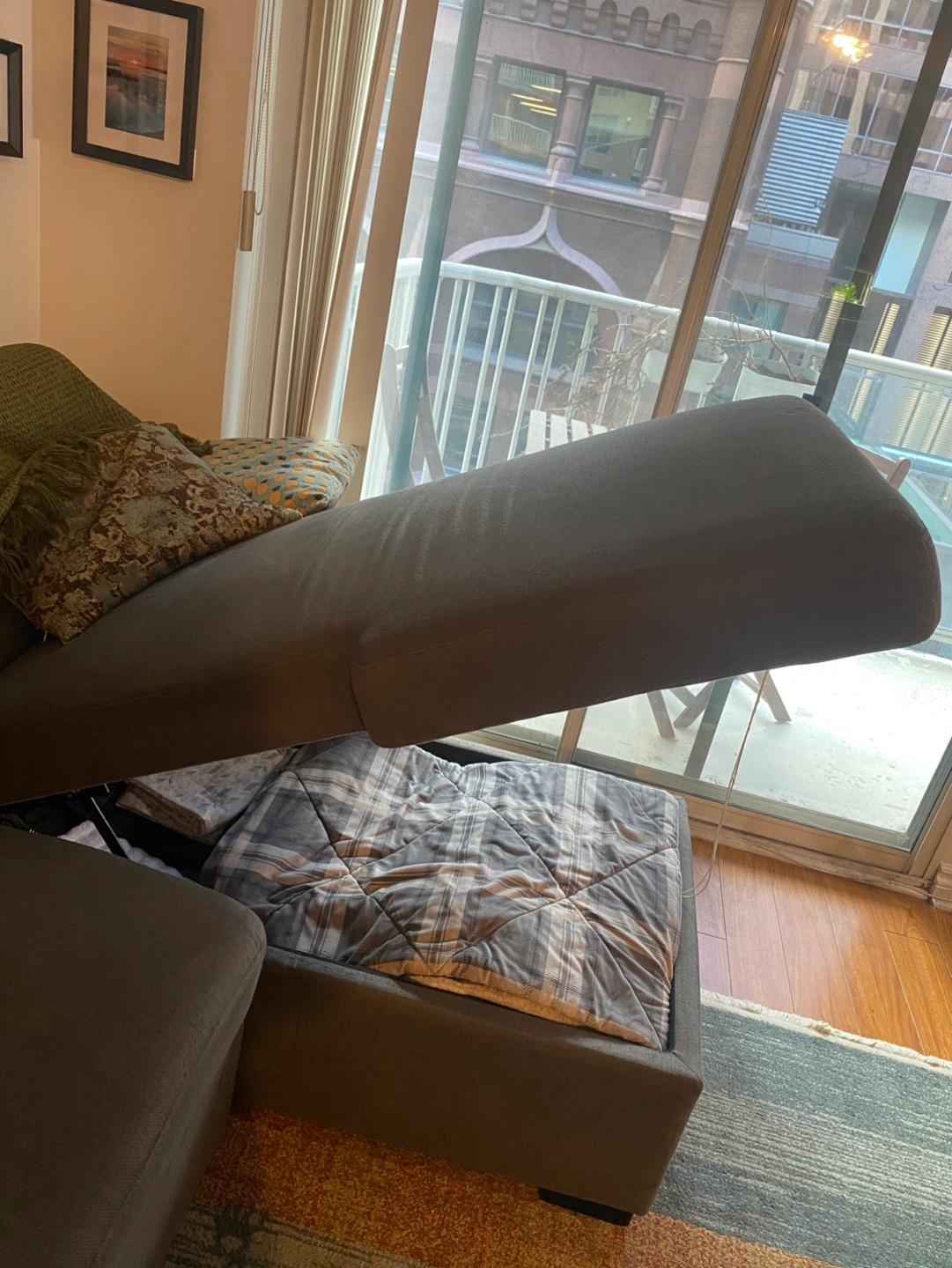 •Hidden compartment to store blankets, pillows, or anything else you need to keep organized.