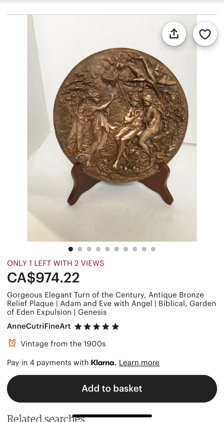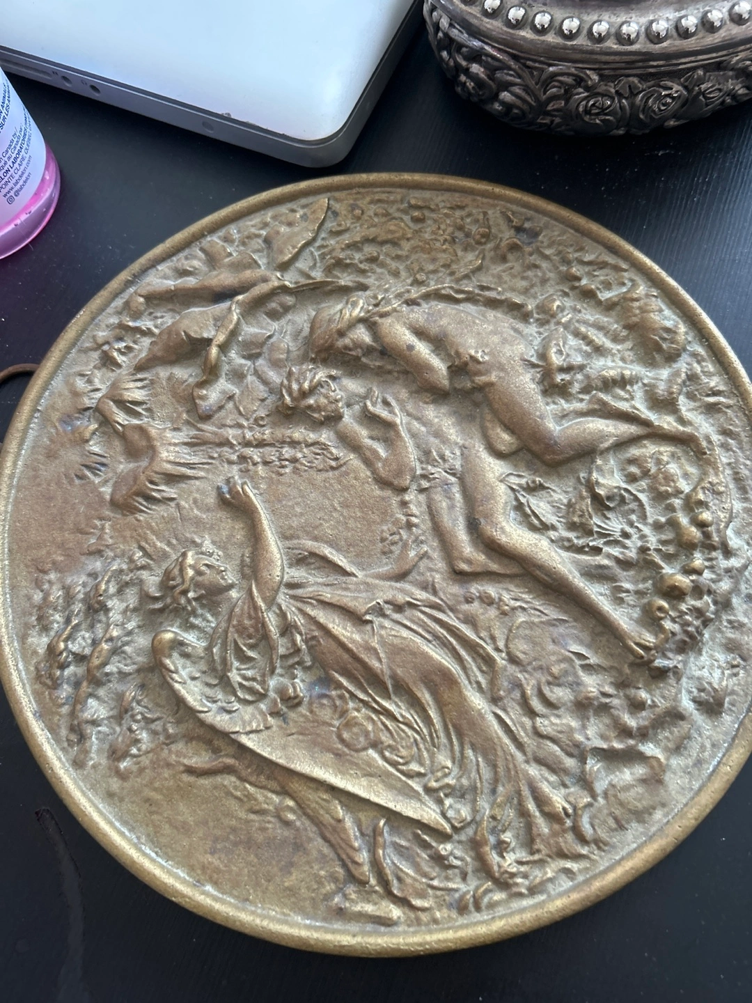 Gorgeous elegant turn of the century antique bronze relief plaque. Depicts Adam and Eve with angel. Biblical, Garden of Eden expulsion, Genesis theme. Vintage from the 1900s. Beautiful detail.