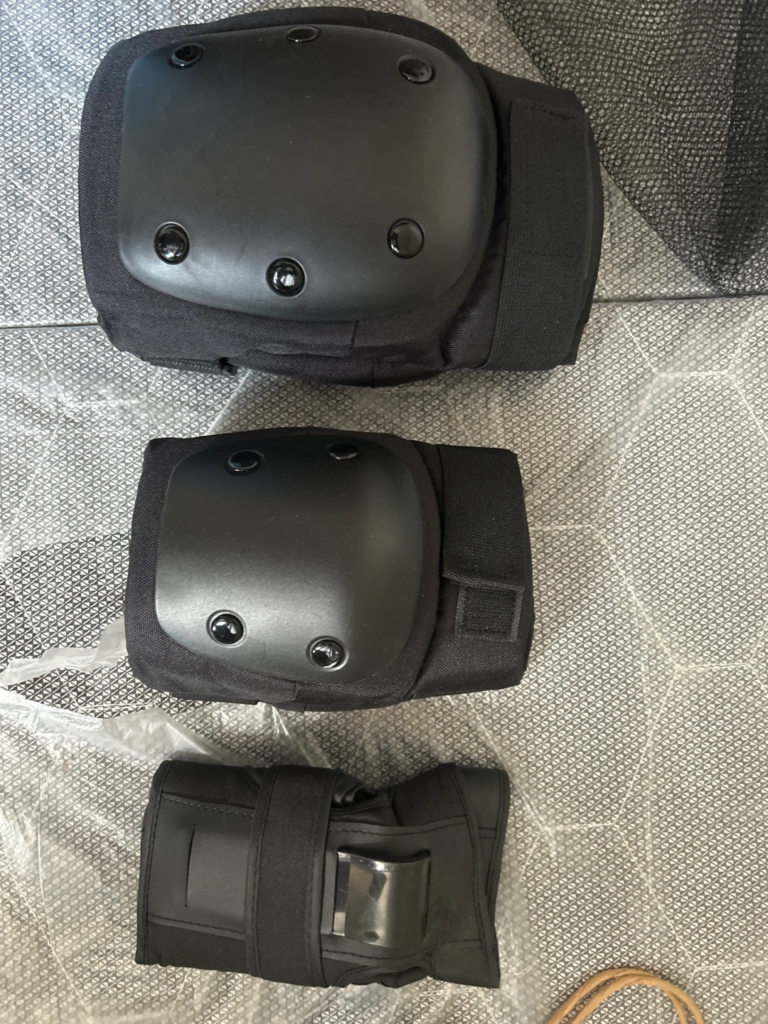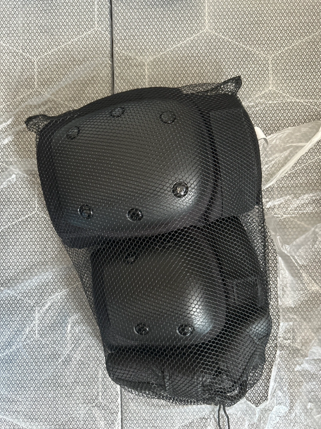 Black protective gear set. Includes one pair of knee pads, one pair of elbow pads, wrist protector and a mesh carrying bag. Great for skateboarding, rollerblading, or other activities.