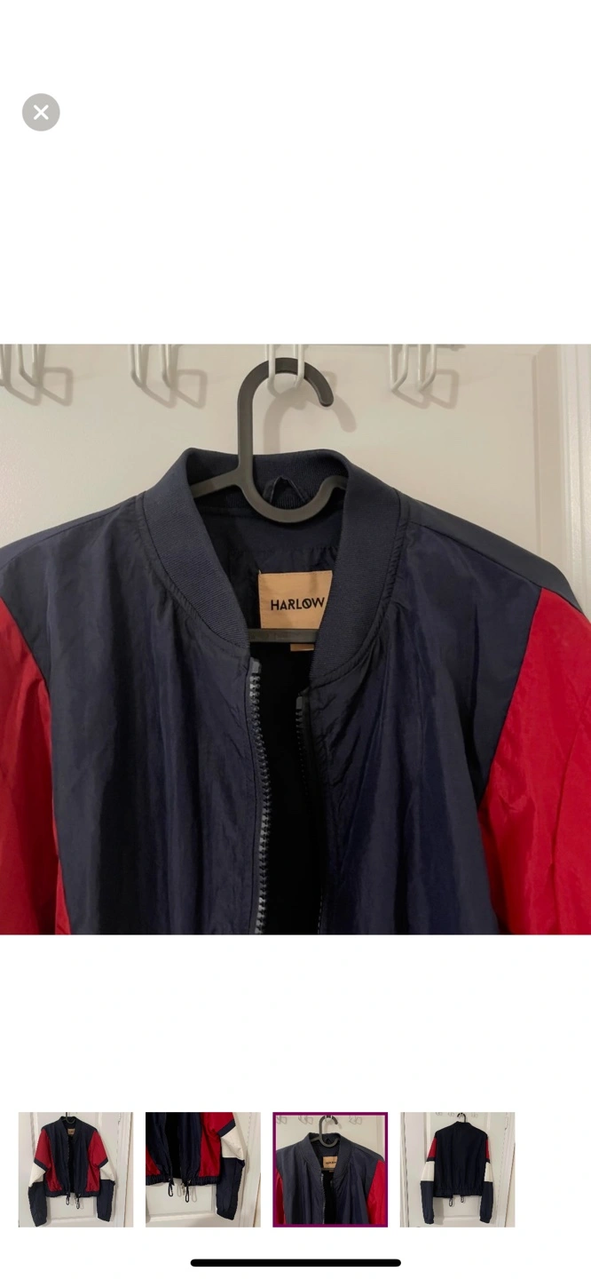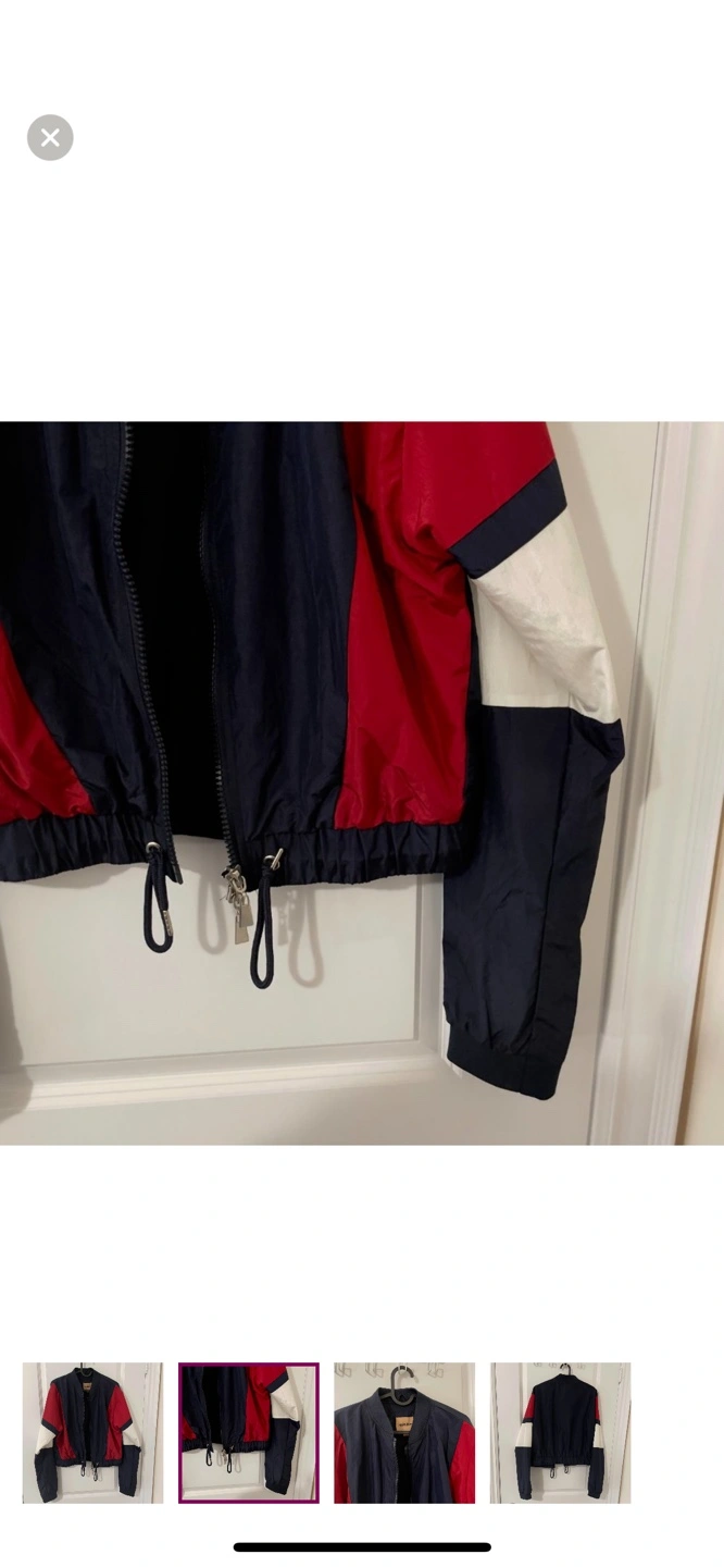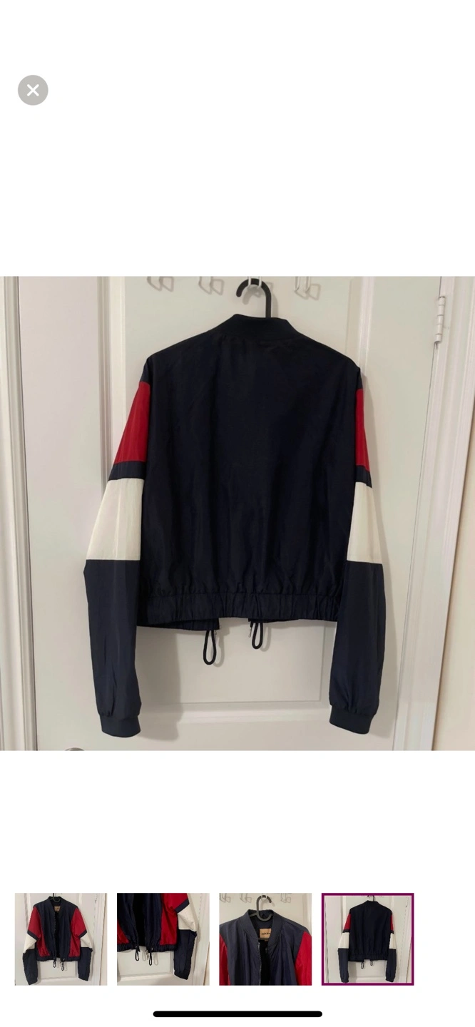 Lightweight cropped bomber jacket. Features a navy, red, and white colour-block design. Zip front closure and drawstring hem. Long sleeves.