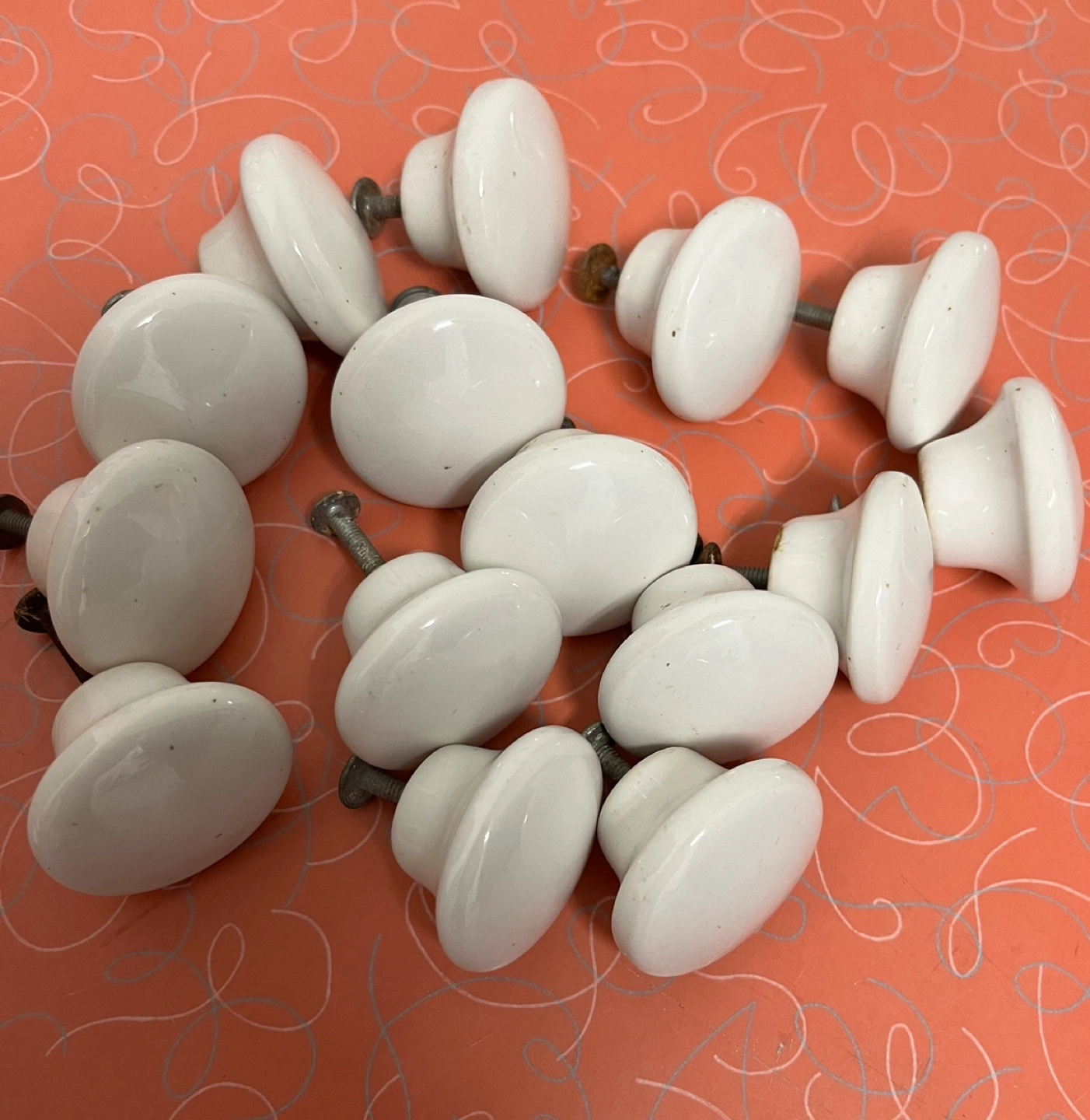 15 vintage white ceramic drawer knobs. Small, round knobs with a slightly domed top. Metal screws included. Great for restoration projects.