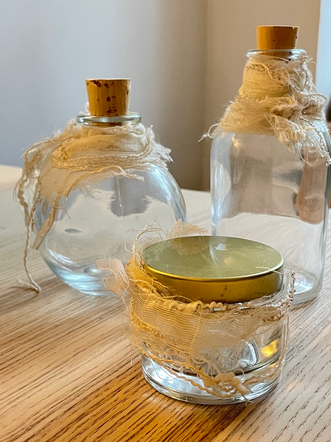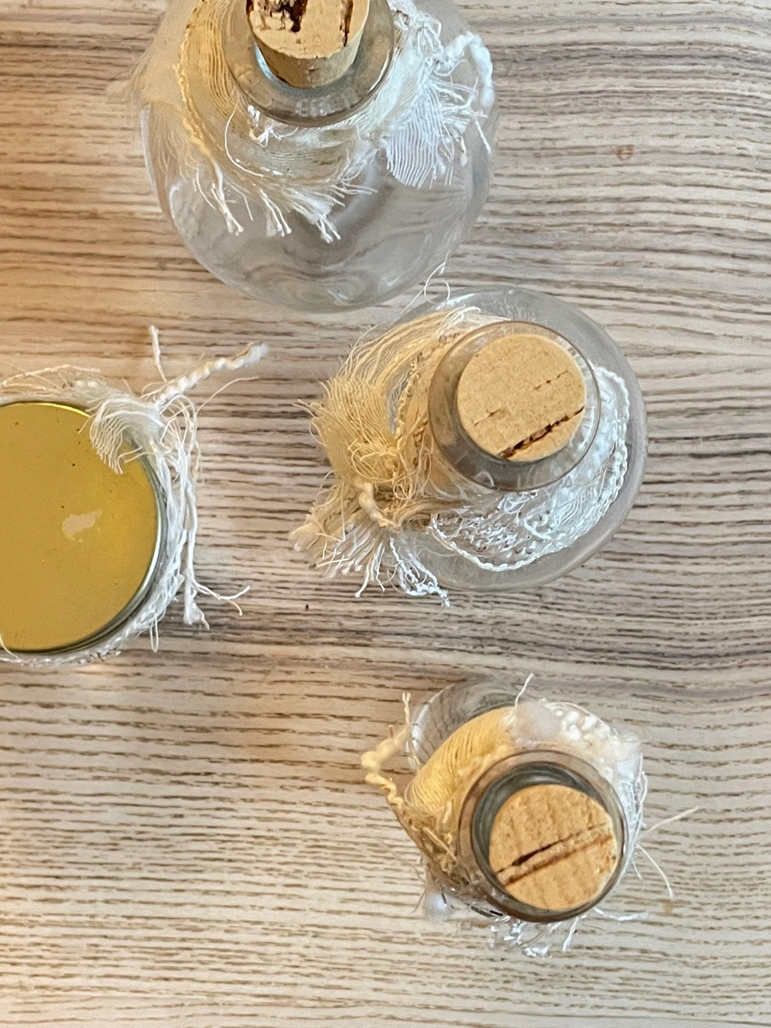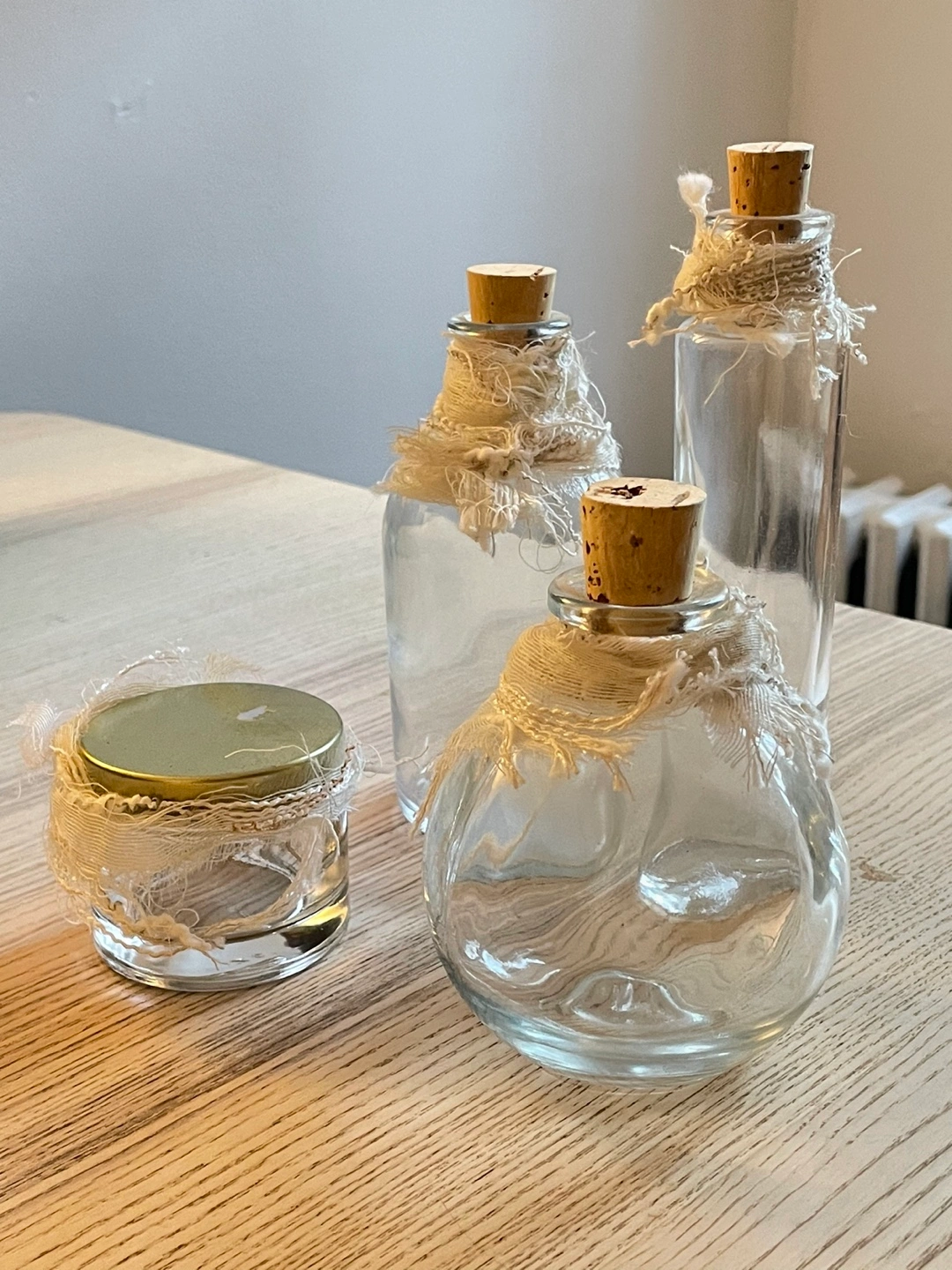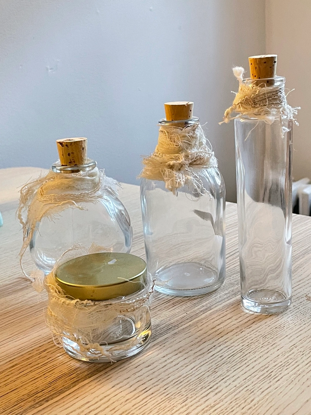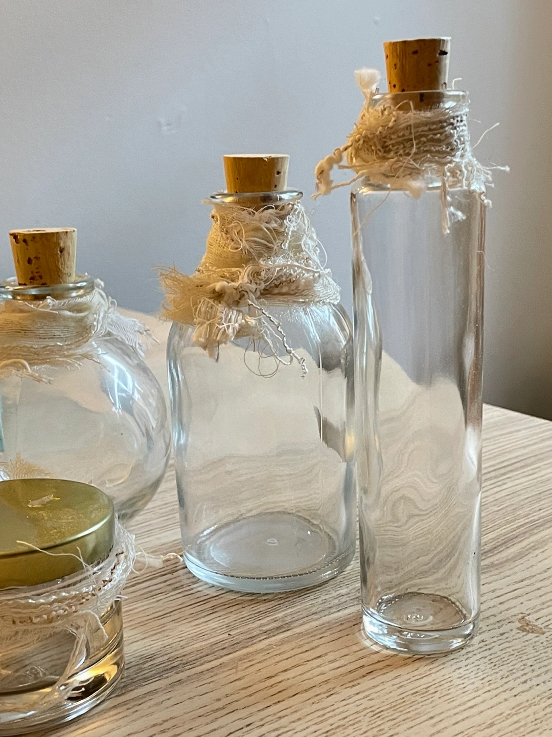 Unique set of four empty glass bottles. Various shapes and sizes. Each bottle features a cork stopper and is wrapped with textured fabric. Perfect for essential oils, bath salts, or home decor.