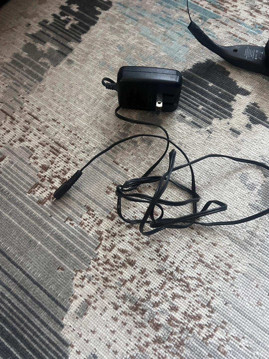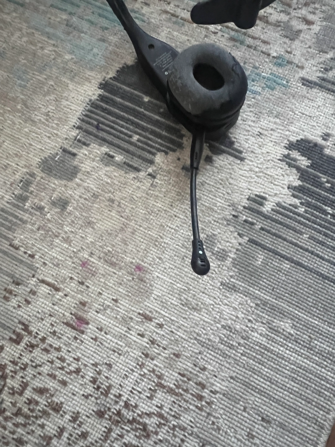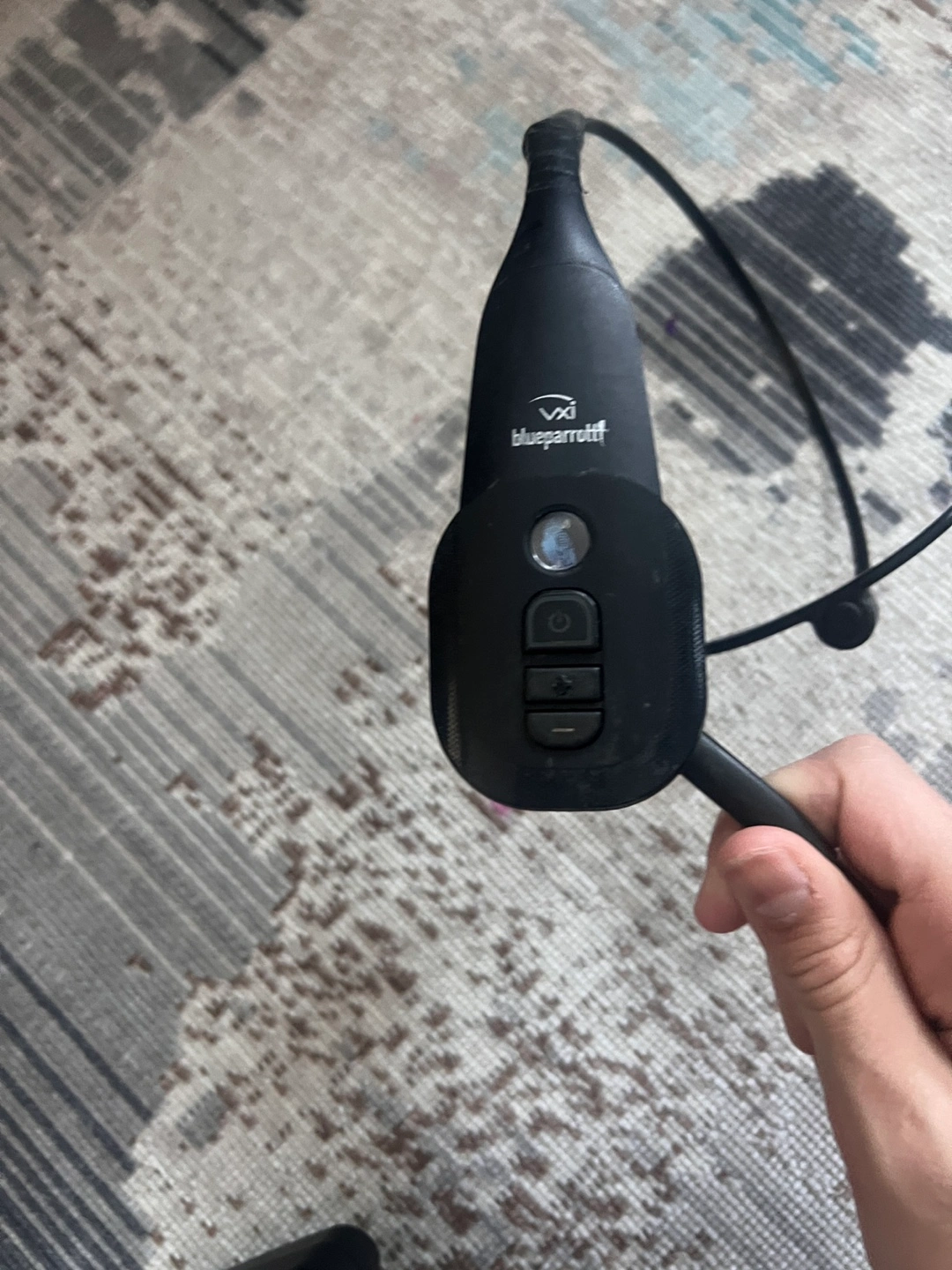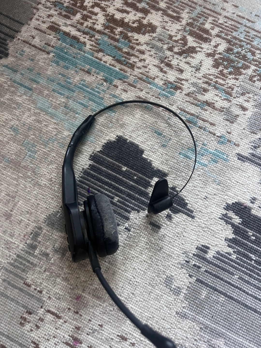 Wireless headset. Bluetooth enabled. Features a boom microphone and over-the-ear design. Shows some wear.