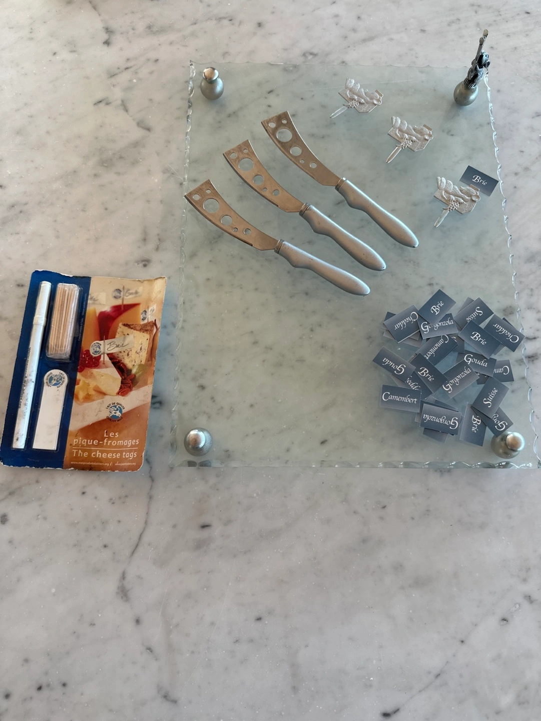 Glass cheese board, three cheese knives, cheese markers, and a package of additional markers. Perfect for entertaining.