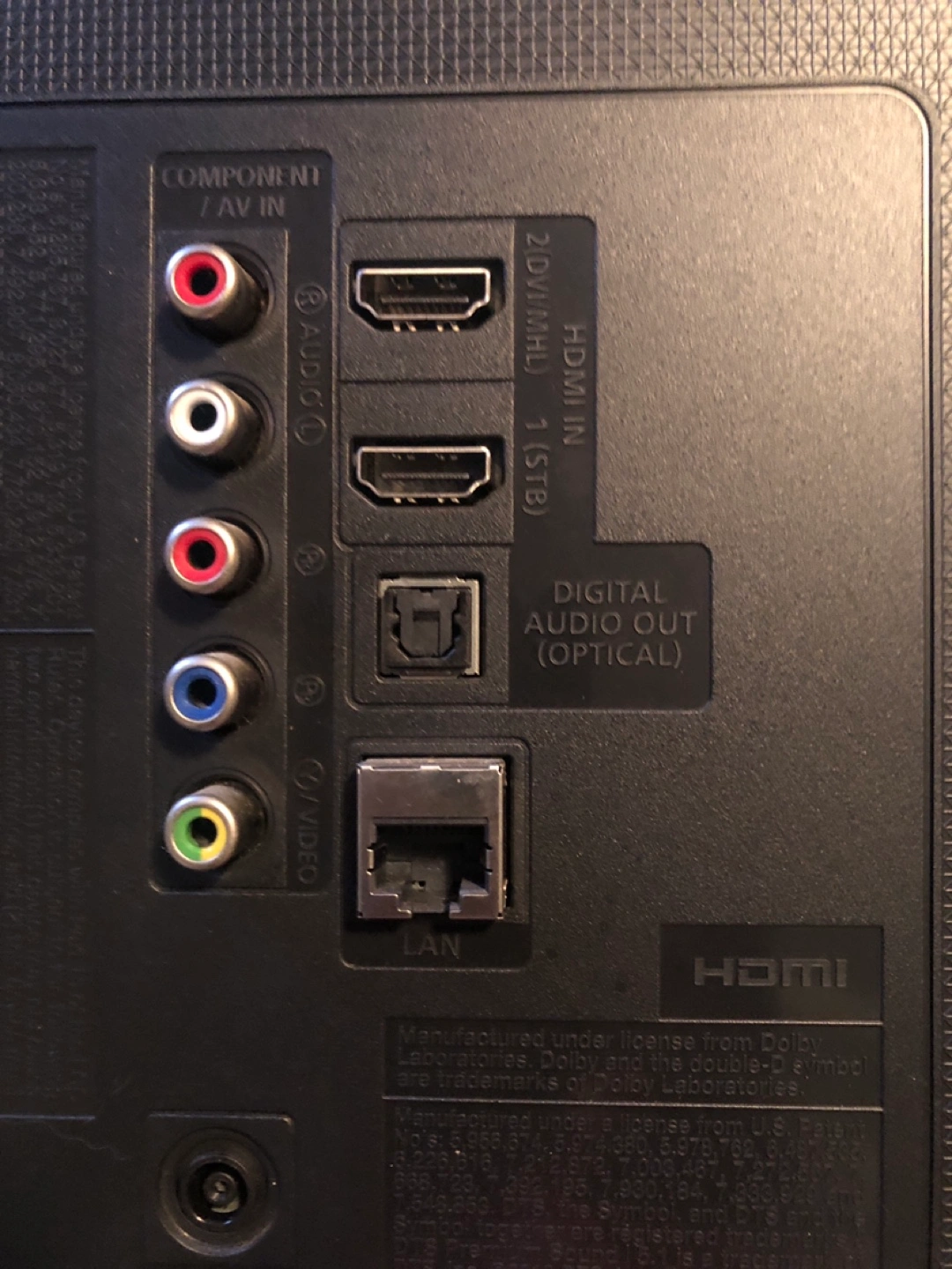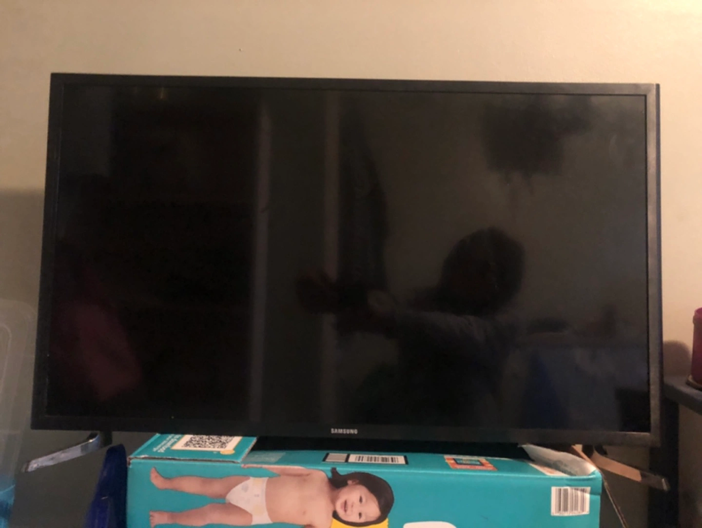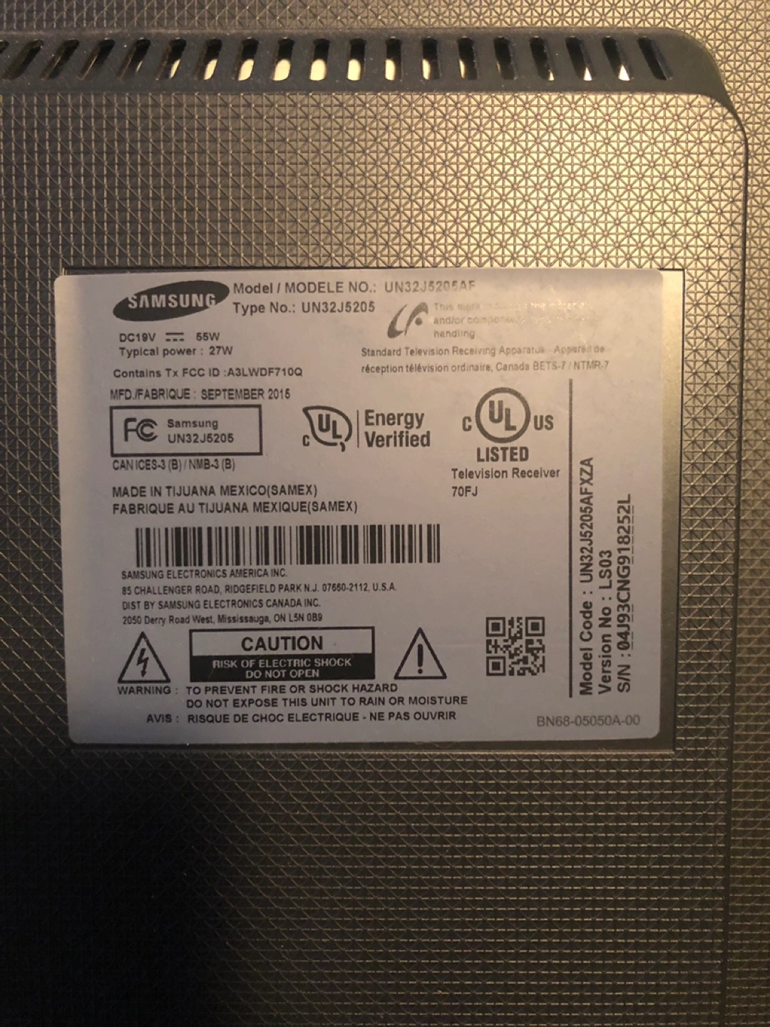 32-inch Samsung Smart TV. Includes remote. Model number UN32J5205. Features multiple inputs: HDMI, Component, and LAN.