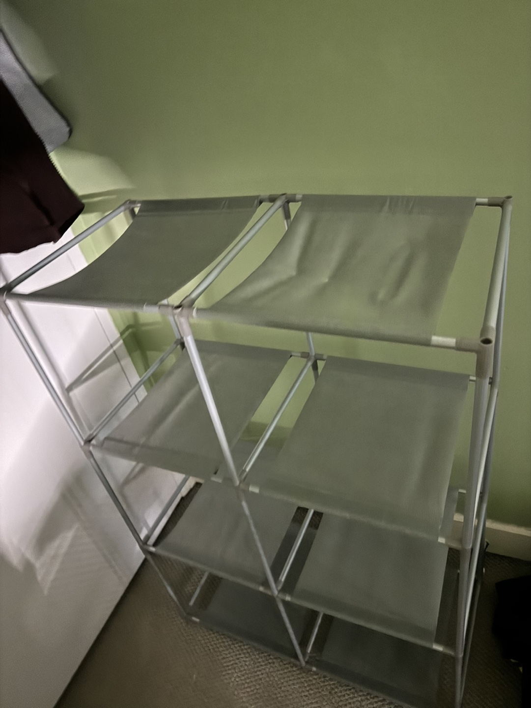 Four-shelf fabric storage unit. Plastic frames. Grey fabric shelves. Good for shoes, clothes, or other storage.