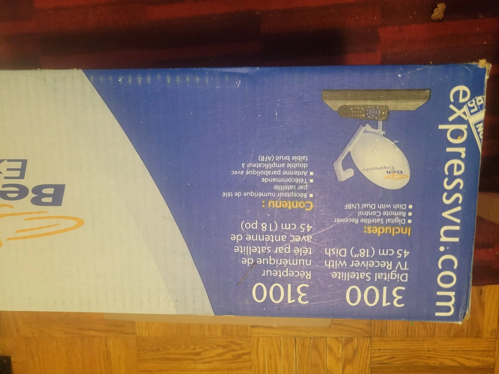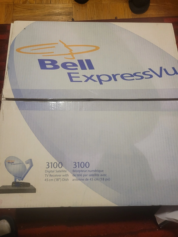 Complete Bell ExpressVu 3100 satellite TV system. Includes 45 cm dish, digital receiver, remote, and all necessary cables. Also includes a do-it-yourself satellite dish installation kit compatible with RCA, Panasonic, Toshiba, and Sony dishes.It is a very good deal. Make an offer !