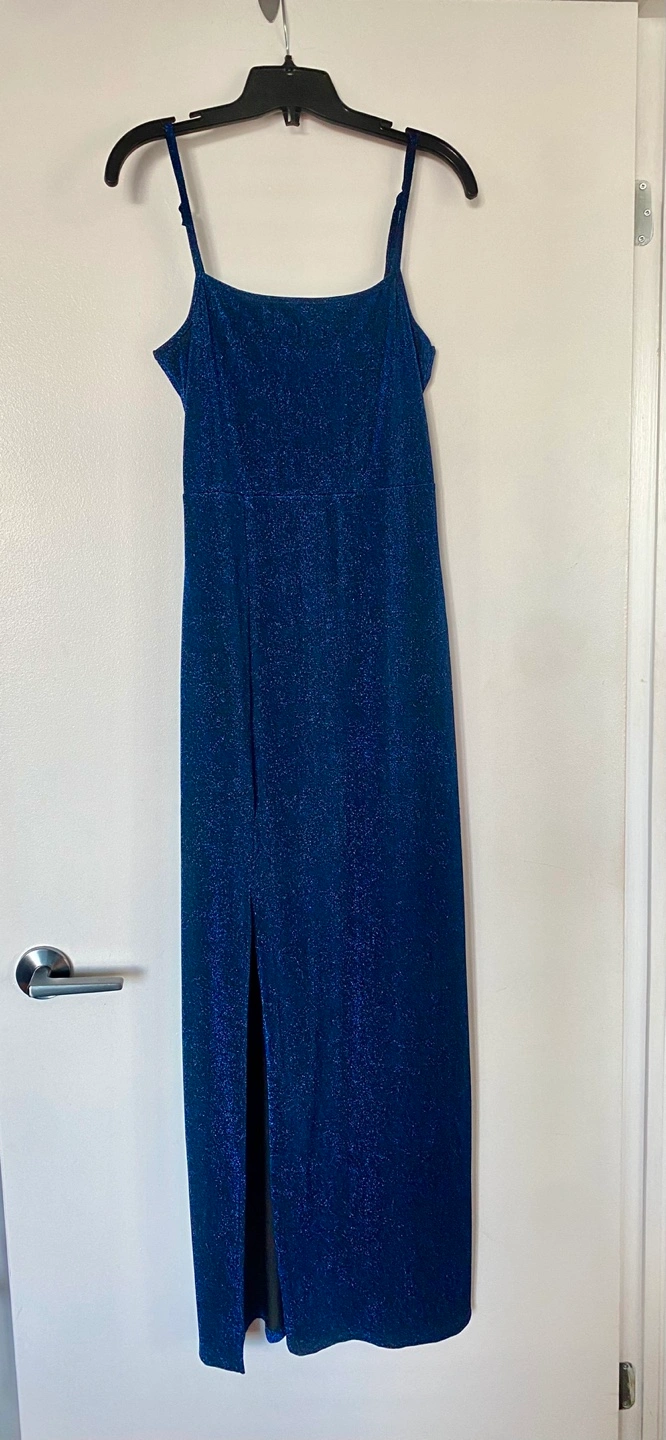 Gorgeous blue sparkly maxi dress. Features thin straps and a thigh-high slit. Perfect for a night out or special occasion. Sz med