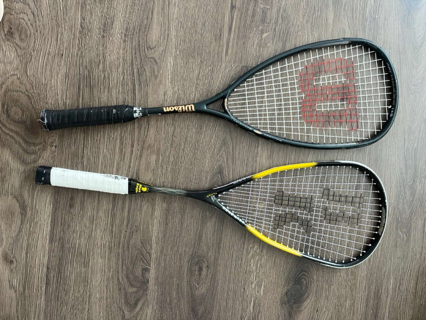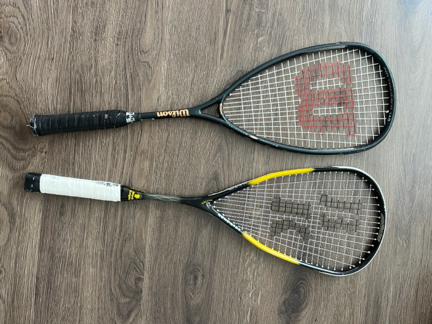 Pair of used squash racquets. One black Wilson racquet, one yellow and black racquet. Pre-owned, some wear and tear.