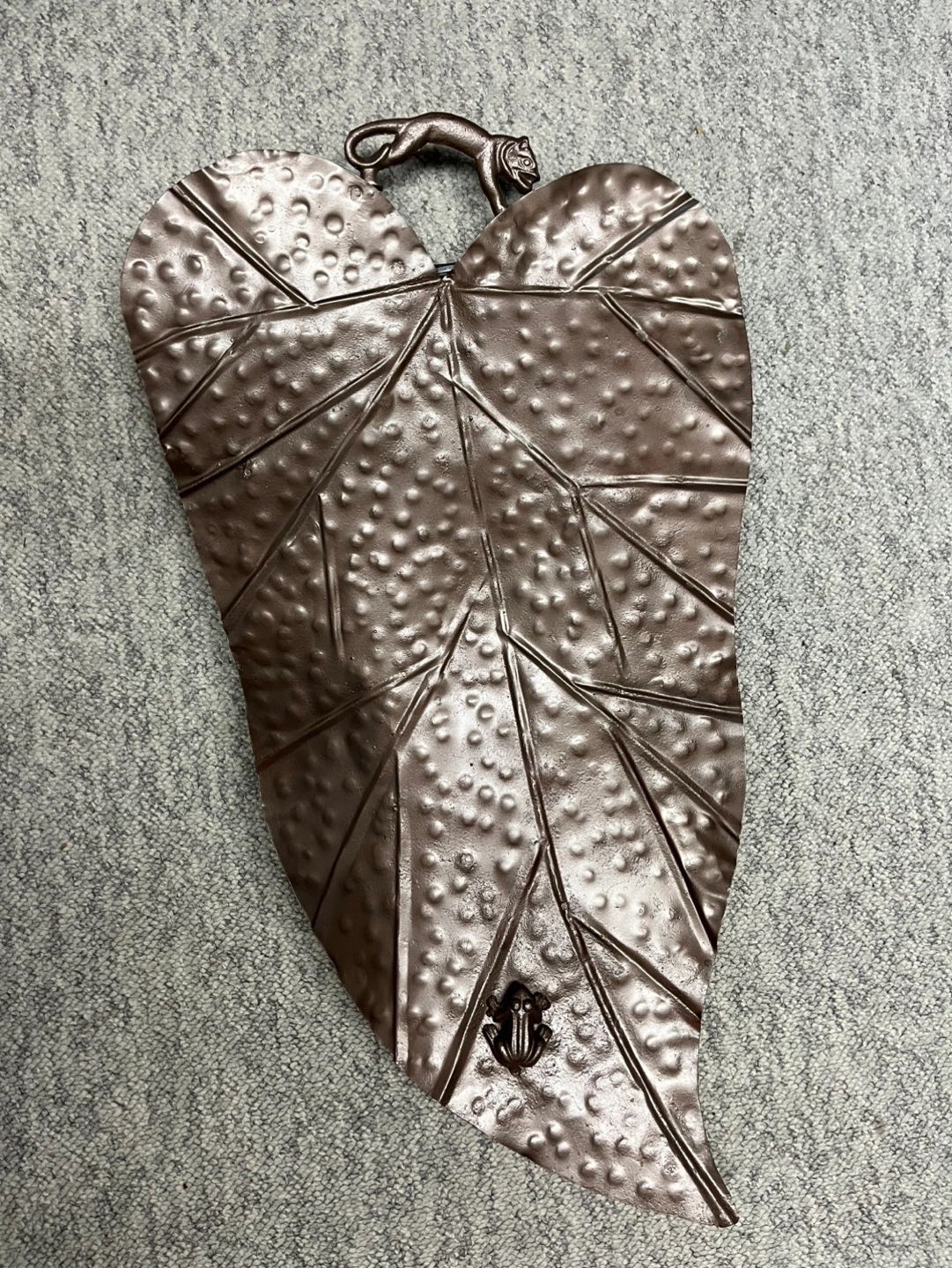132Unique metal wall hanging. Leaf design. Features a small frog and panther accents. Dark brown/bronze finish. Adds character to any room. Can be use as a buffet tray, for potted plants, hang as a decor. Be creative! π