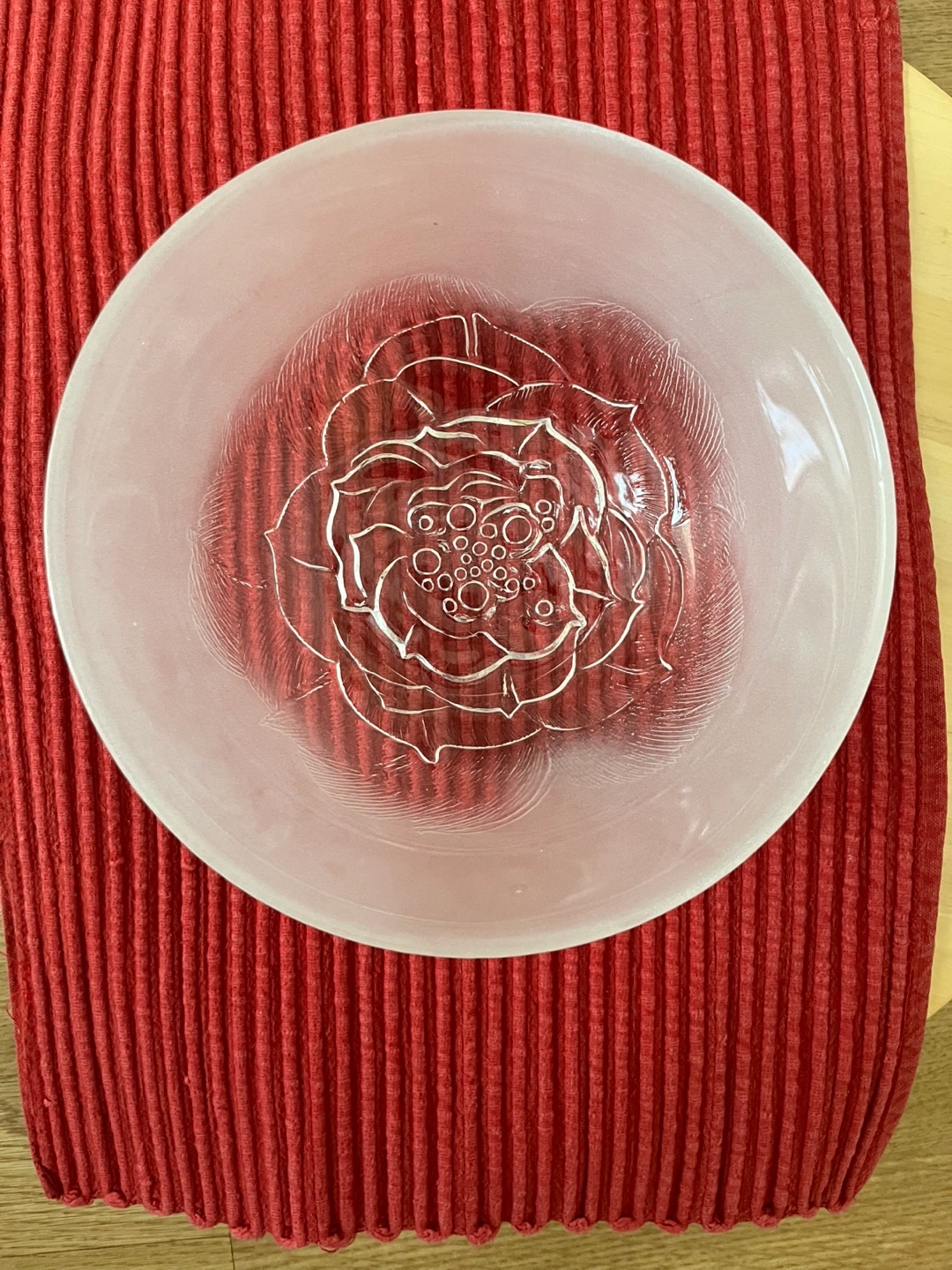 The center of the bowl is clear with an embossed flower on the back side that shows through the glass. The surrounding sides are frosted.