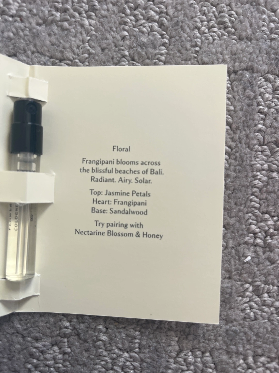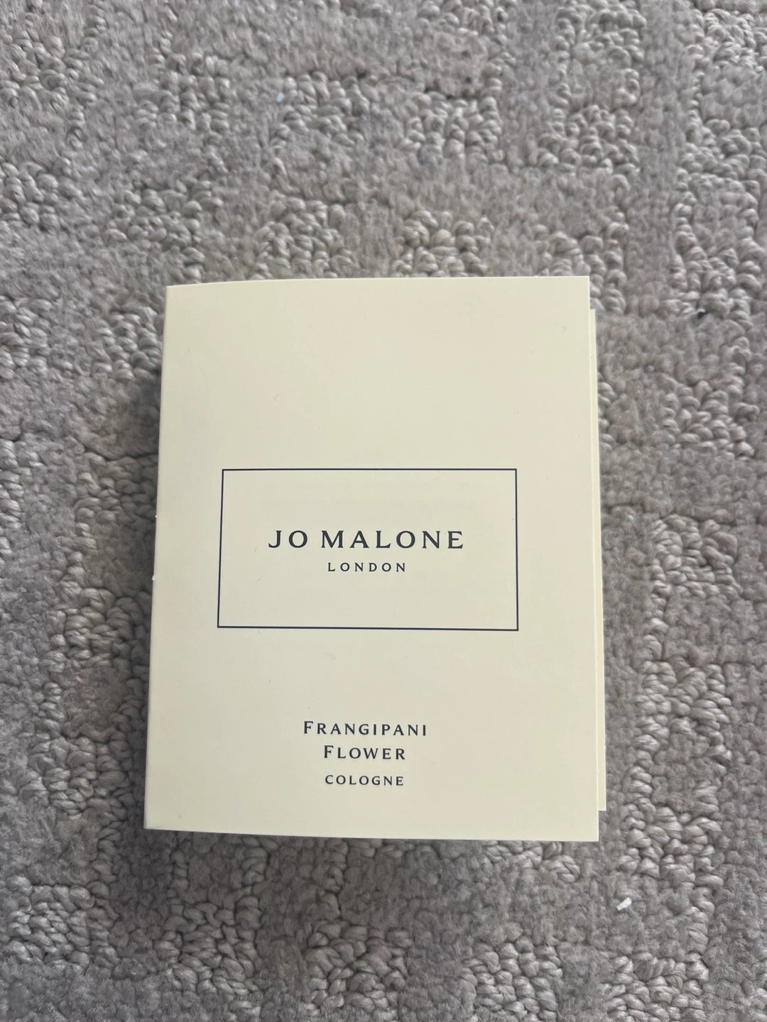 Jo Malone London Frangipani Flower Cologne sample. 1.5ml. Floral fragrance. Top notes: Jasmine petals. Heart notes: Frangipani. Base notes: Sandalwood. Pairs well with Nectarine Blossom & Honey.