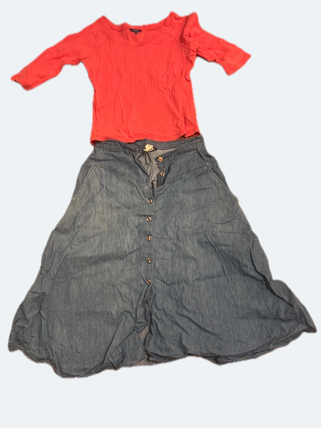 Women's outfit. Coral 3/4 sleeve top and a denim button-front maxi skirt. Casual summer look.