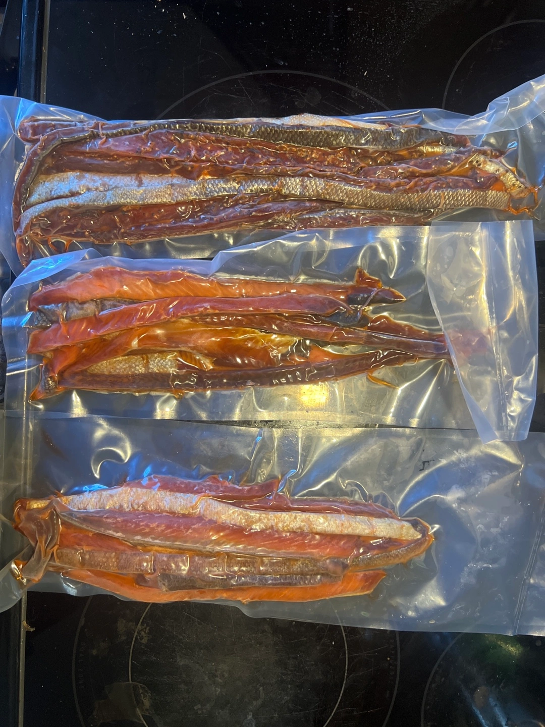 vacuum-sealed packages of smoked salmon . ready-to-eat. Great for snacking or adding to recipes. $30 per pack or 5 packs for $100