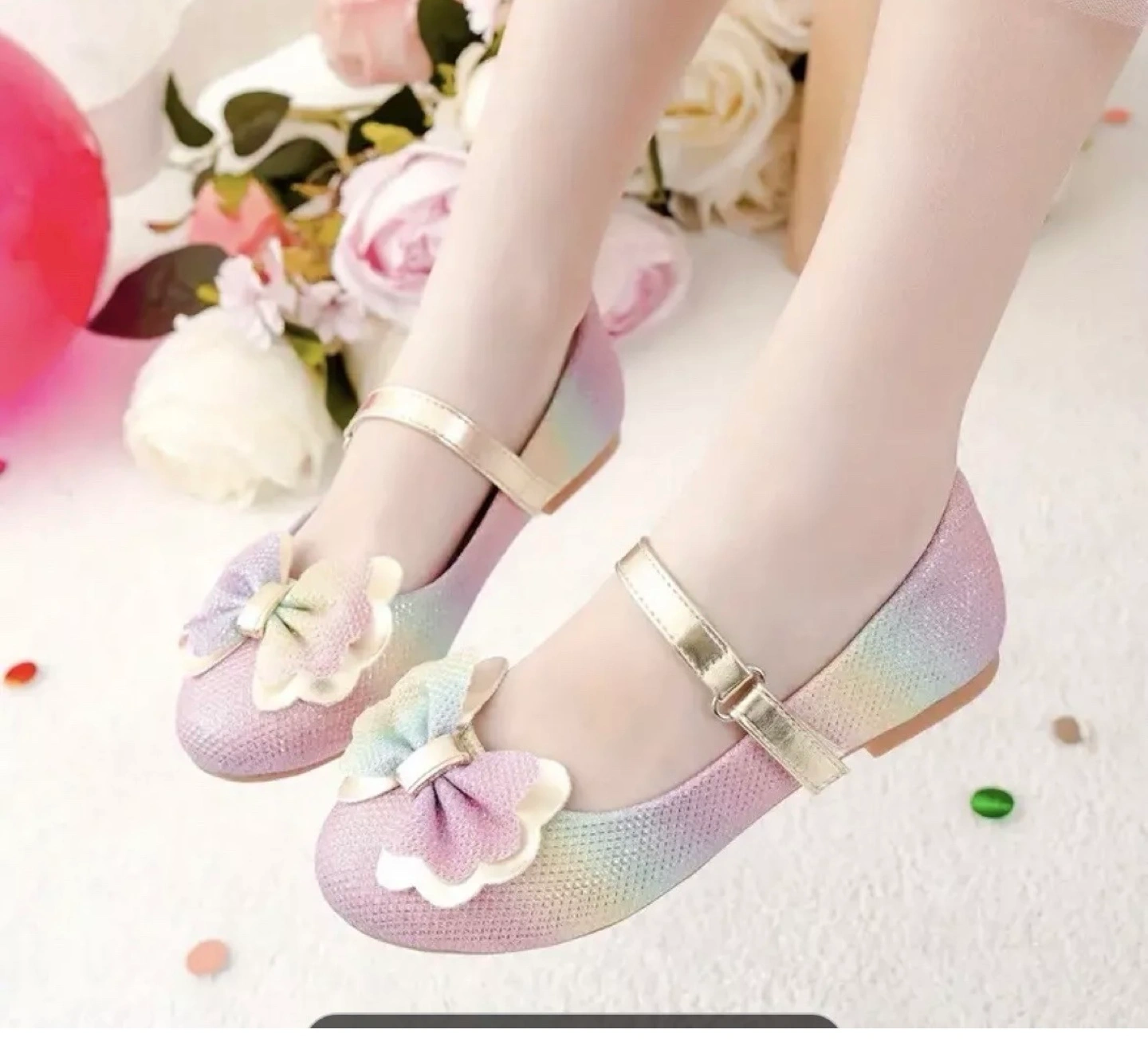 Adorable girls' flats. Rainbow ombre design. Gold buckle accents. Pretty bow detail. Perfect for parties or special occasions.