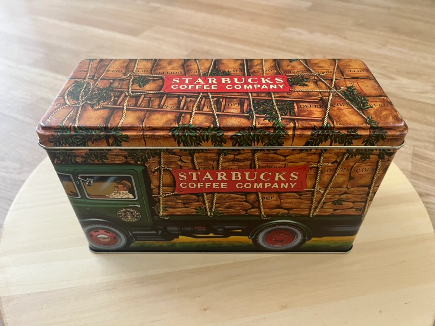 Collectible Starbucks tin. Features a vintage truck design. Ideal for storing coffee, tea, or other small items. Shows minor wear.