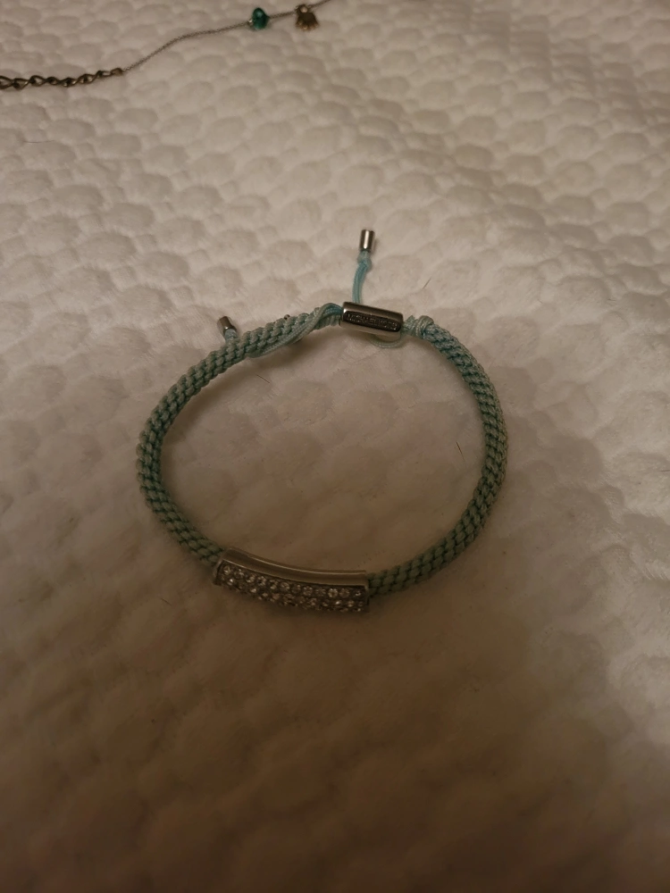 Adjustable light blue braided bracelet. Features a silver bar with clear crystals. Silver clasp with Michael Kors logo.