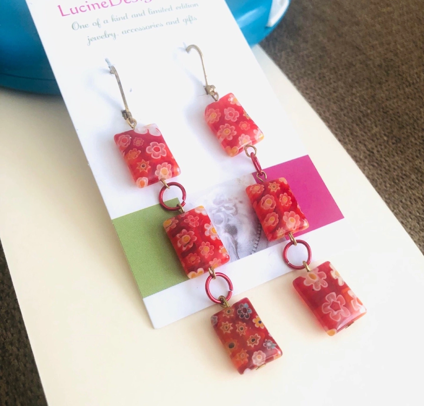 Three red rectangular floral patterned beads dangle from gold hooks. Unique handmade jewelry. Perfect for adding a pop of color to any outfit.